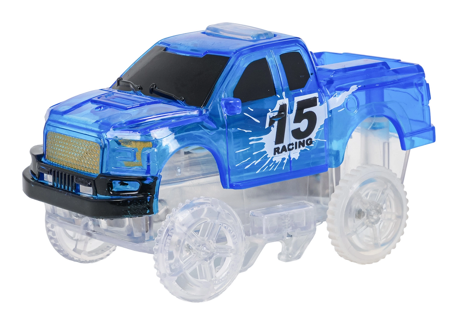 Priehľadné pretekárske autíčko s LED diódami oživí trať. Stačí stlačiť tlačidlo na streche. Napájanie 2× AA (nie sú súčasťou).