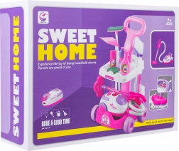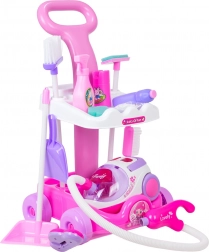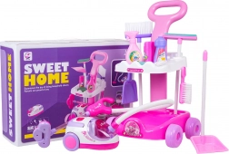 Sada ponúka komplexnú výbavu: dlhú kefu, lopatku, zmetáčik, stierku na okná, hubku, atrapy čistiacich prostriedkov a polystyrénové guľôčky do vysávača. Vďaka šikovnému usporiadaniu na dvoch policiach je všetko prehľadne uložené a ľahko prenosné.