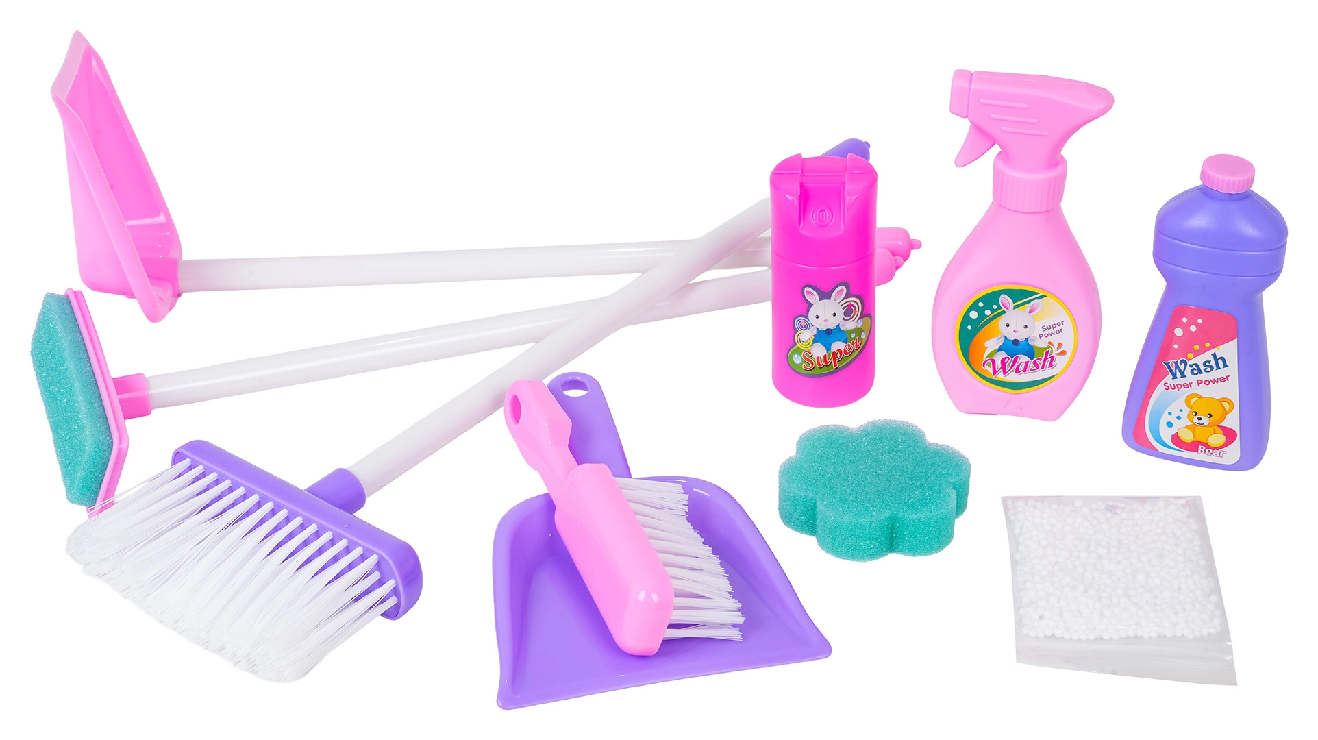 Metla, lopatky, zmetáčik, stierka na umývanie, hubka a atrapy čistiacich prostriedkov. Nechýbajú ani polystyrénové guľôčky určené do vysávača.