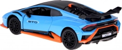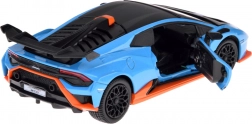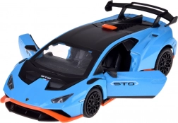 Tento detailne spracovaný model LAMBORGHINI Huracán STO v mierke 1:32 poteší deti aj dospelých fanúšikov supersportov. Kovová karoséria v modrej metalíze s čiernymi a oranžovými akcentmi, verné línie a veľké zadné krídlo podčiarkujú autentický vzhľad. Otváranie dverí aktivuje svetelné a zvukové efekty – rozsvietia sa svetlá a ozve sa zvuk motora a klaksónu.