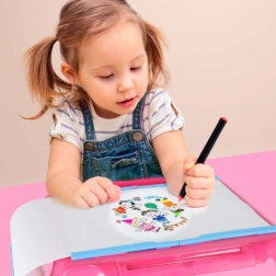 Súčasťou balenia je 6 listov s motívmi (spolu 72 obrázkov), sada 12 pasteliek a 12 fixiek. Stolík má integrované úložné priehradky a priehľadnú bezpečnostnú kryciu doštičku. Je ideálny pre deti od 3 rokov, rozvíja jemnú motoriku, sústredenie a fantáziu.