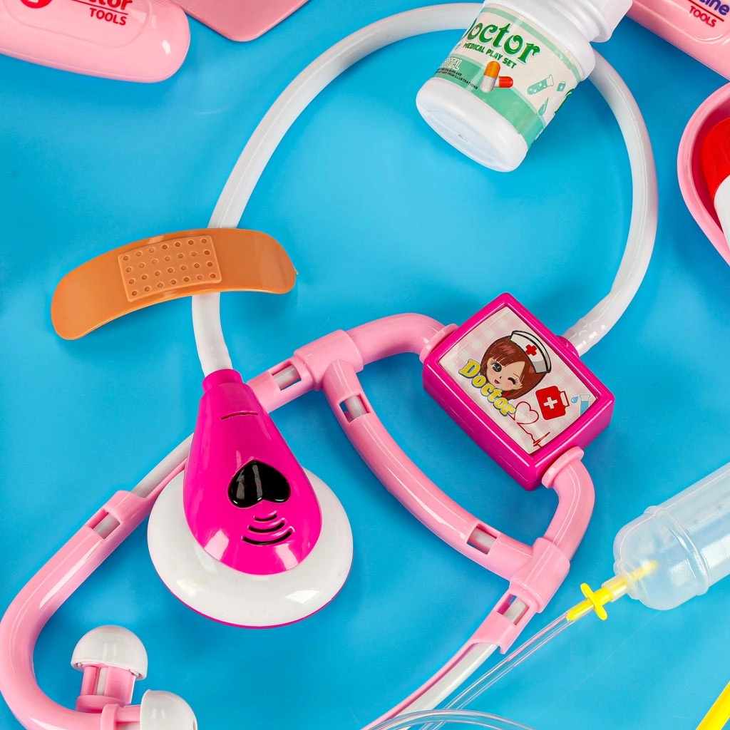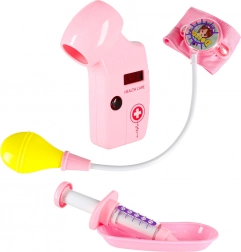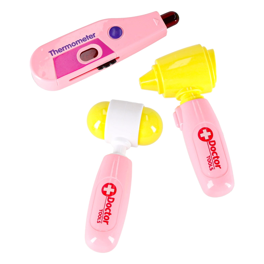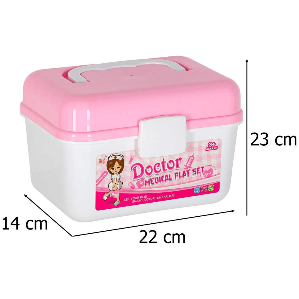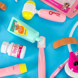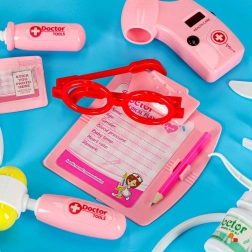Roztomilý lekársky kufrík v bielo‑ružovej farbe s kostýmom a bohatou sadou 35 dielov premení každé dieťa na malého lekára alebo sestričku. Obsahuje interaktívne nástroje so svetlom a zvukom (stetoskop s tlkotom srdca, teplomer, otoskop, pulzný oxymeter, svietidlo), zubné nástroje aj IV stojan pre realistickú hru. Skvelá hračka, ktorá rozvíja fantáziu, uvoľňuje strach z lekára a učí zdravotnej prevencii a hygiene.