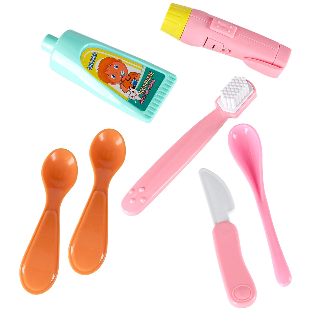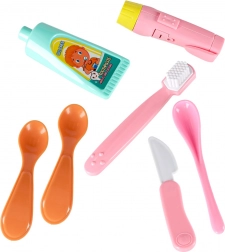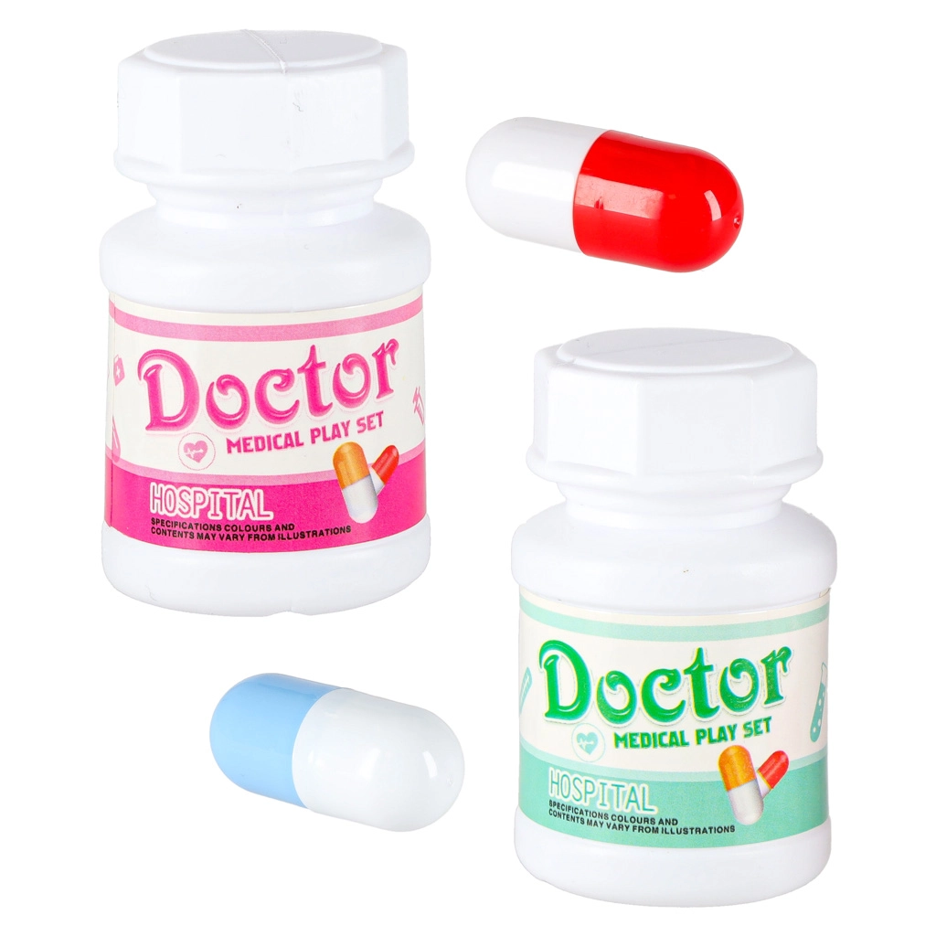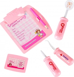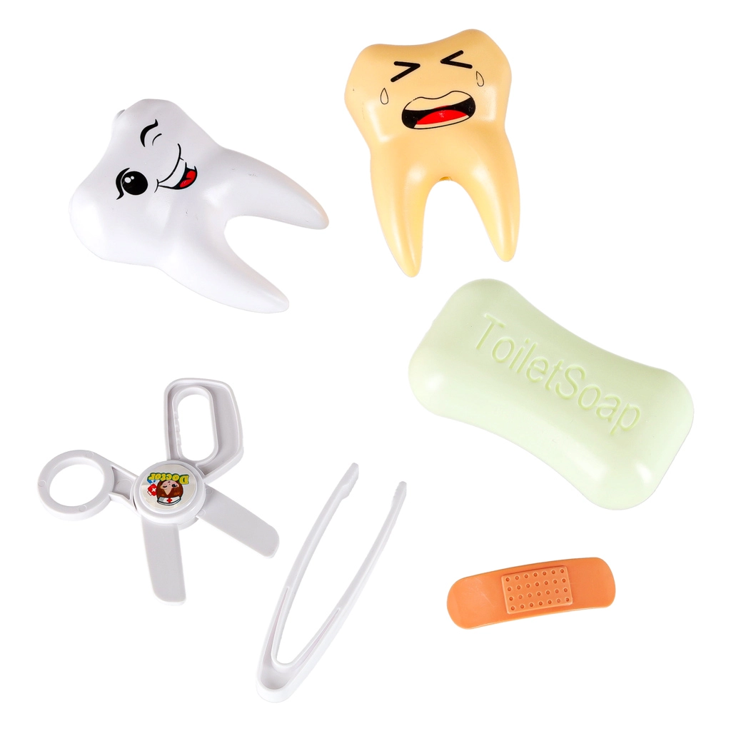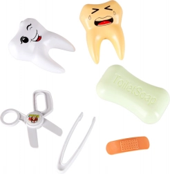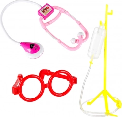 - lekársky plášť a čiapka, uzatvárateľný kufrík s uchom, skladací IV stojan, skladací tlakomer s pumpičkou, menovka, podložka s klipom a ceruzkou, skladací stetoskop, otoskop, svietidlo, teplomer, pulzný oxymeter, zubné zrkadielko, „vŕtačka“, „injekcia“, žltý „pokazený“ zub, biely zub s plombou, pasta a kefka na zuby, neurologické kladivko, mydlo a dóza, skalpel (hračkový), pinzeta, nožnice, 2× dóza na lieky, 2× krabička v tvare kapsuly, lyžičky, náplasť, okuliare, návod