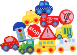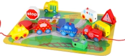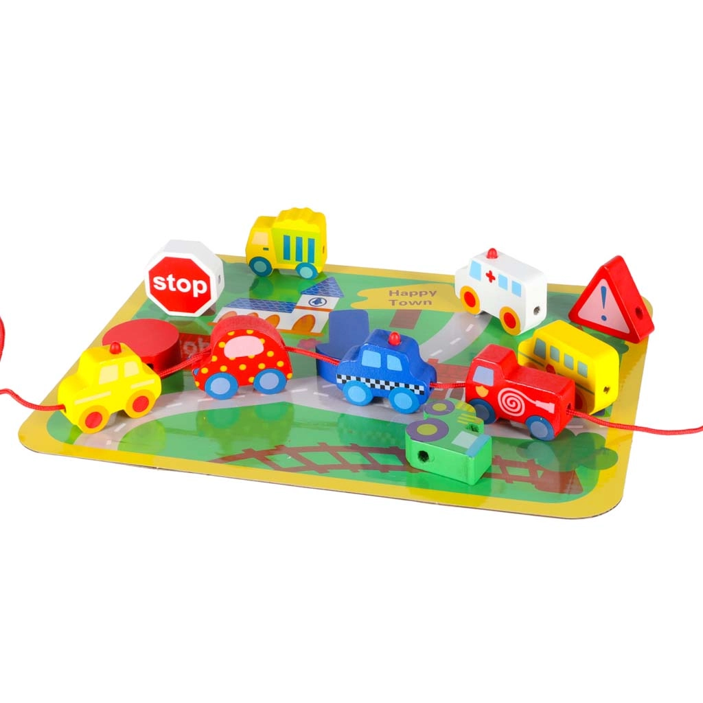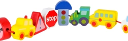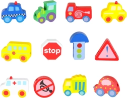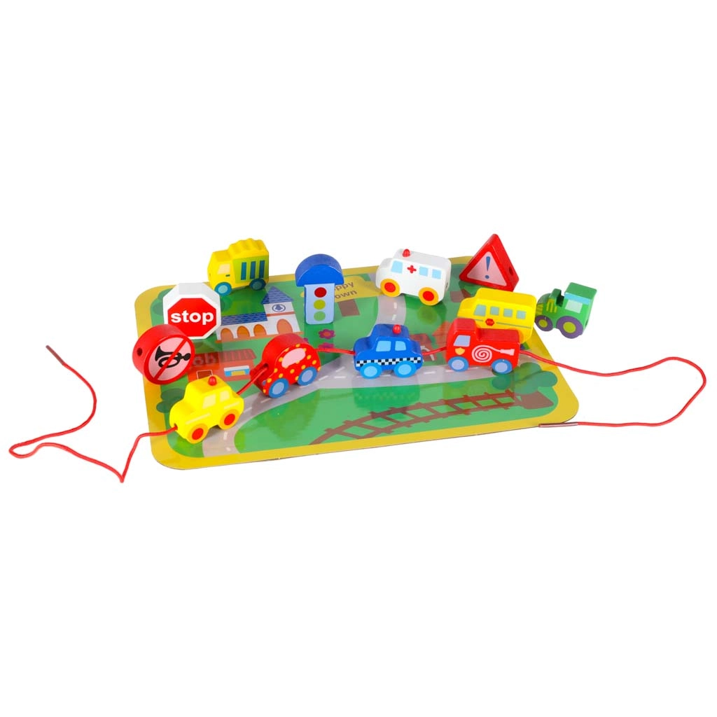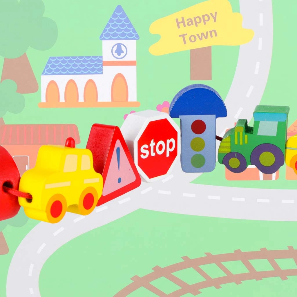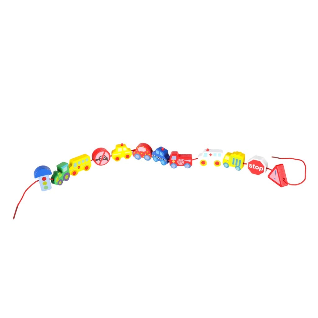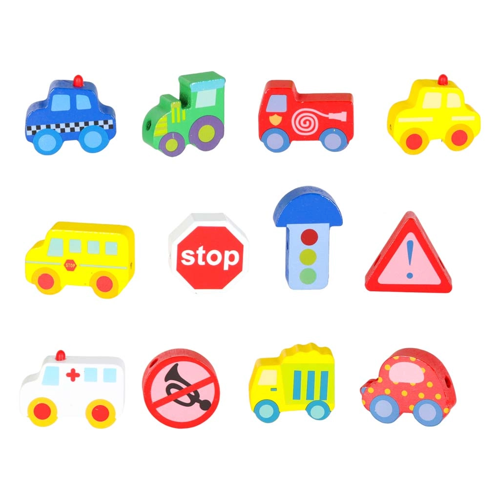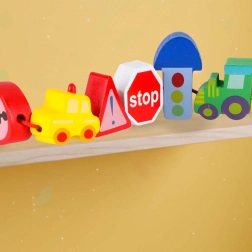 Masívne, hladko opracované kocky v tvare vozidiel a značiek sa ľahko uchopujú a vďaka priechodným otvorom sa pohodlne navliekajú na šnúrku.