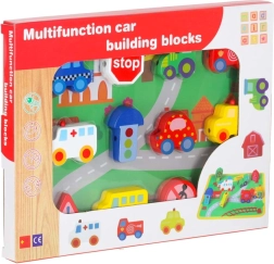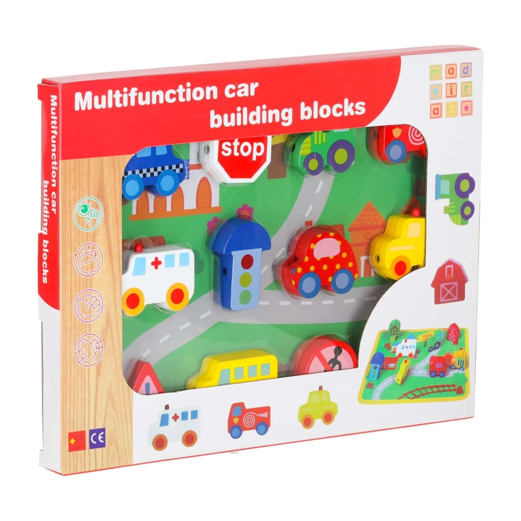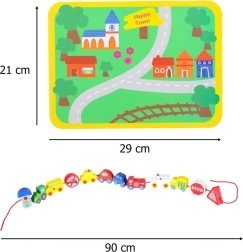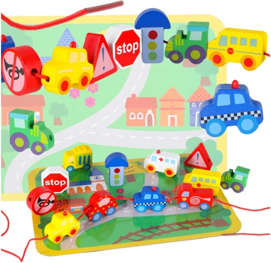 Táto kreatívna sada kombinuje navliekanie drevených kociek s voľnou hrou na podložke „mestečko“. Deti si precvičia úchop, presnosť pohybov aj trpezlivosť, zatiaľ čo spoznávajú autá, sanitku, autobus, políciu aj dopravné značky. Diely sú hladko opracované, príjemné na dotyk a bezpečne farebné.