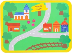 Farebná podložka s cestami a budovami podnecuje predstavivosť a učenie dopravných situácií, ideálna na samostatnú aj spoločnú hru.