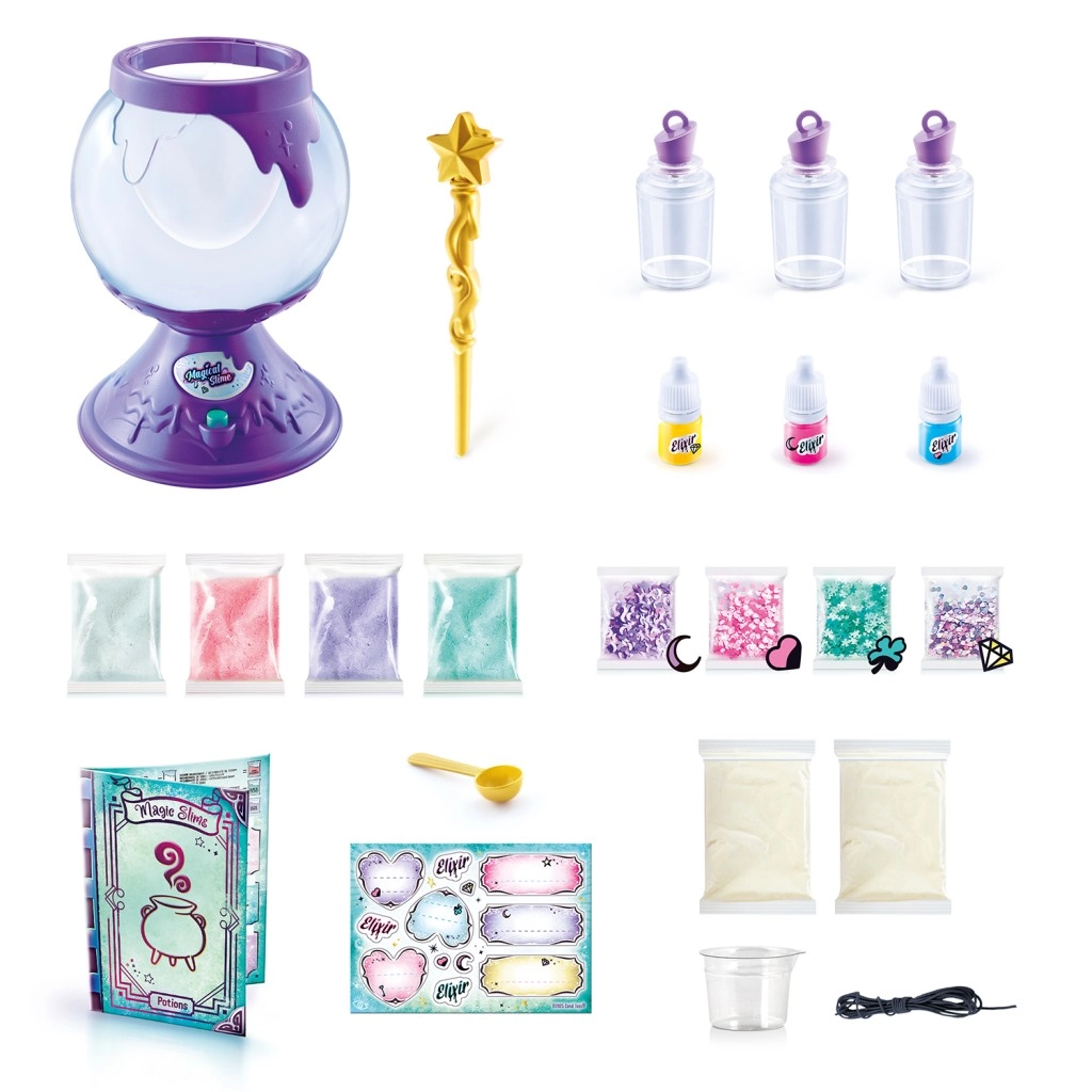 Vytvorte až 10 očarujúcich slizových elixírov v magickom kotlíku so svetelnými a hmlovými efektmi. Postupujte podľa receptov a namiešajte meniace farby, svietiace v tme aj bublajúce elixíry. Stačí nasypať prášok, pridať elixír a dekorácie, zamiešať zlatou paličkou a hotové slizy uložiť do štýlových fľaštičiek na krk.