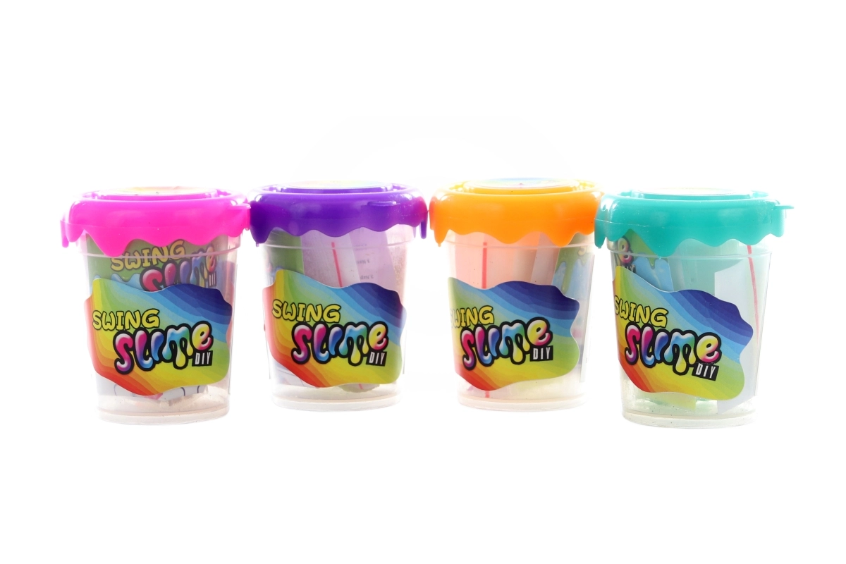 - Plastový kelímok s viečkom, prášok na prípravu slizu, trblietky, malá figúrka, návod na použitie