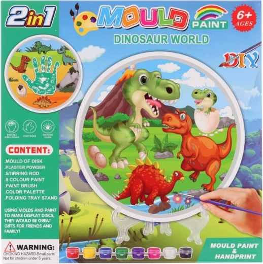- 5 vrecúšok so sadrou, 8 farbičiek, miska, 2 štetčeky, okrúhla forma s motívom dinosaurov, plastový stojanček