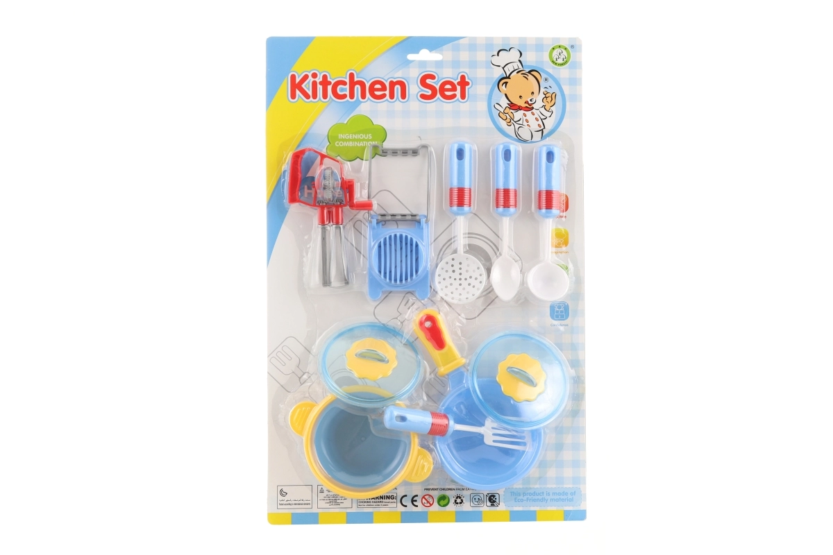 Hracia sada do kuchynky pre malých kuchárov obsahuje všetko potrebné na hranie sa na varenie. Nájdete v nej hrniec s pokrievkou, panvicu s pokrievkou, obracačku, naberačky, krájač na vajíčka a ručný šľahač. Balené na blistri, ideálne ako darček. Vhodné od 3 rokov.