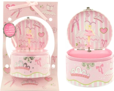 Táto elegantná hracia šperkovnica s baletkou ponúka ideálne miesto na uloženie prstienkov, náramkov a ďalších drobností. Po otvorení veka a natiahnutí kľúča začne baletka ladne tancovať pred zrkadielkom a rozoznie sa príjemná hudba. Vďaka kompaktným rozmerom sa šperkovnica ľahko zmestí na nočný stolík či poličku v detskej izbe.