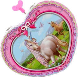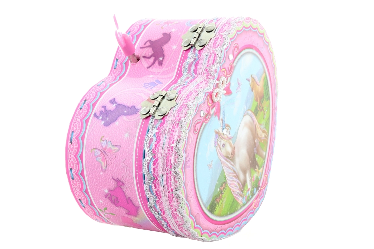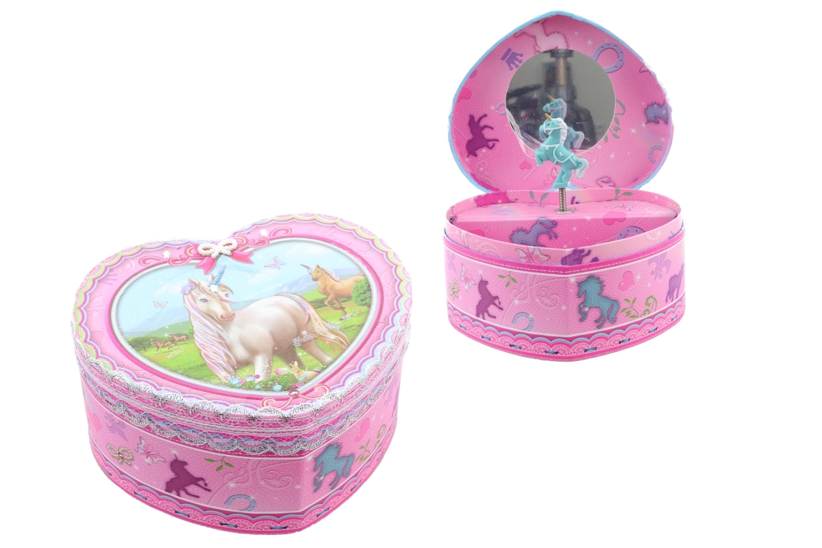 Táto pôvabná hracia šperkovnica v tvare srdca nadchne svojím ružovým dizajnom s jednorožcom a jemnými ozdobnými detailmi. Po natiahnutí kľúča sa pri otvorení veka roztočí baletka pred zrkadielkom a spustí sa melódia, ktorá vytvorí kúzelnú atmosféru pri každom odkladaní šperkov.
