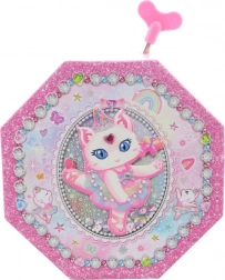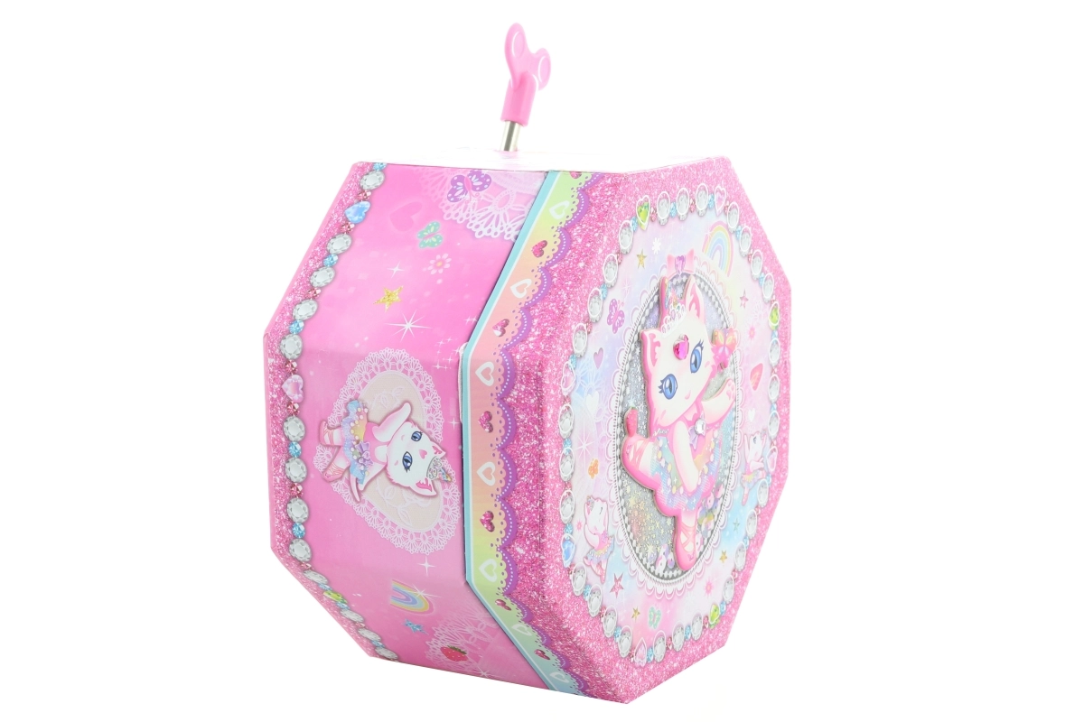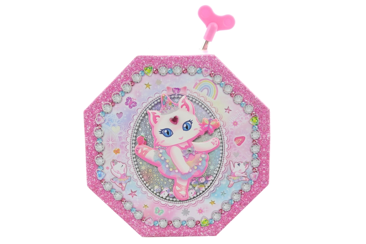 Táto elegantná ružová hracia šperkovnica kombinuje pôvabný dizajn s praktickým úložným priestorom. Po natiahnutí mechanického kľúčika sa vo vnútri pred zrkadielkom roztočí baletka a rozoznie sa melódia, ktorá spríjemní každé otvorenie veka. Šperkovnica je ozdobená roztomilými ilustráciami mačiek a jednorožcov, trblietkami a dekoratívnymi kamienkami.