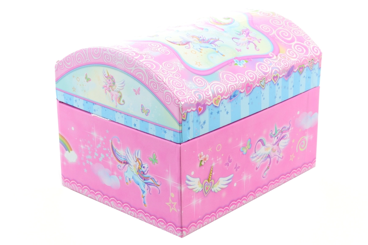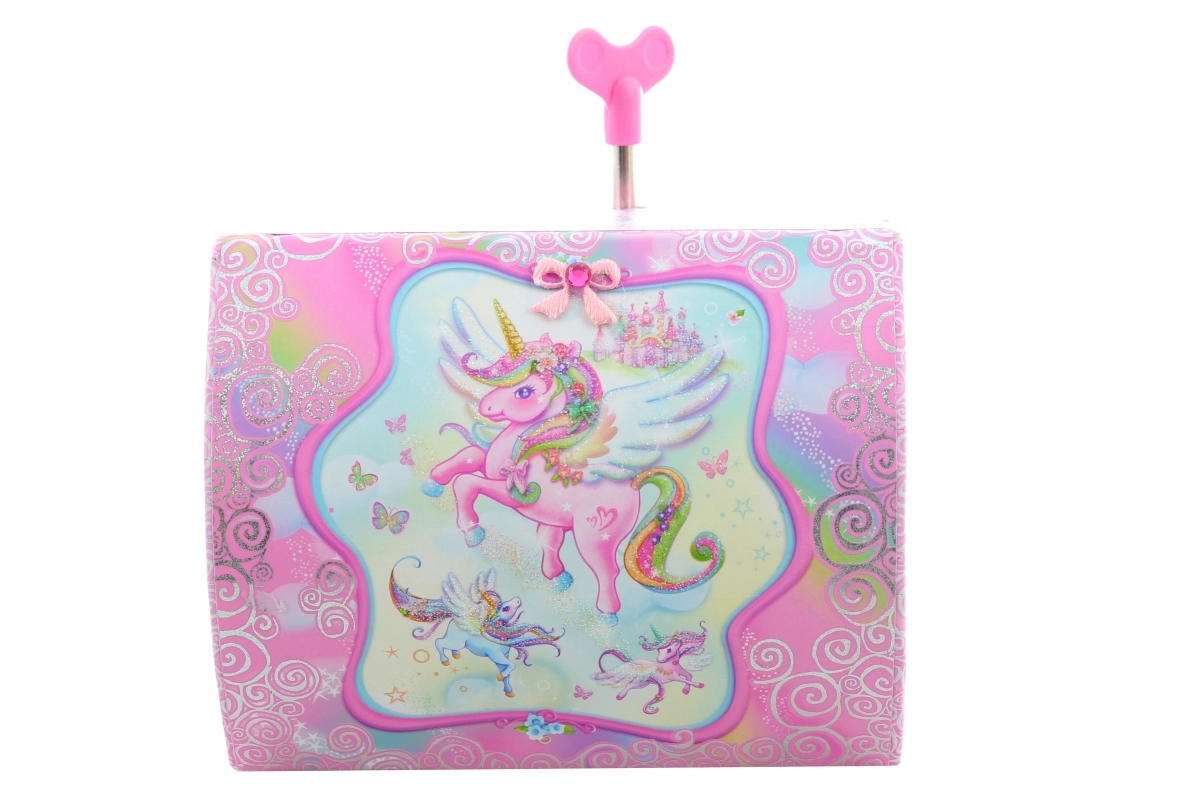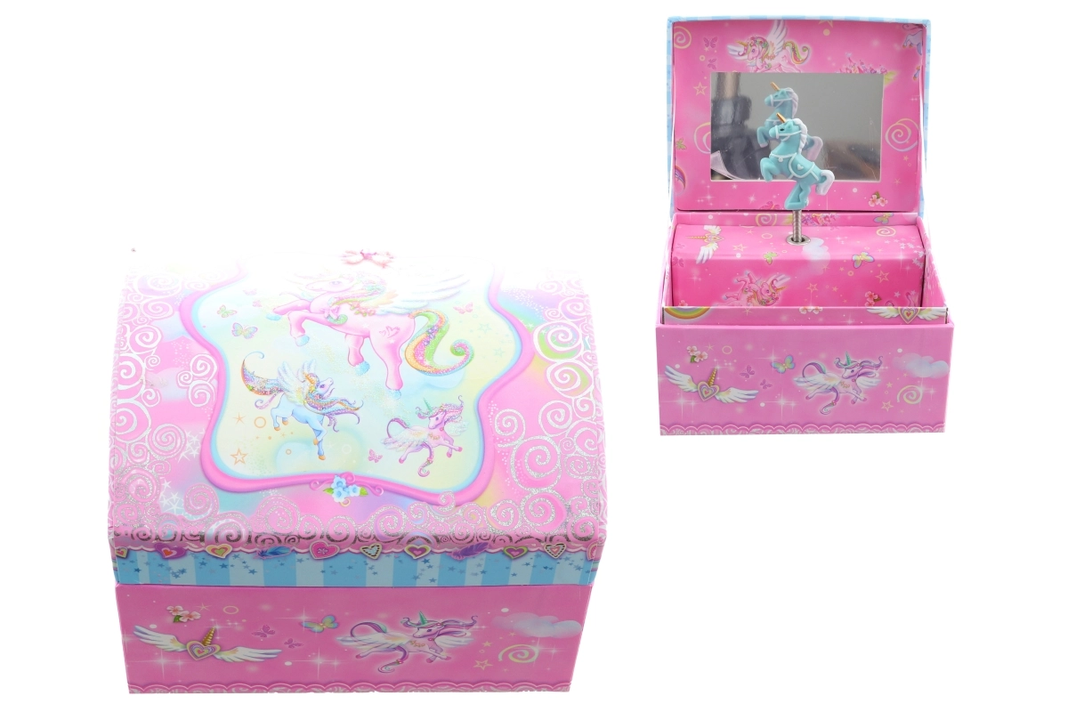 Kúzelná ružová šperkovnica s motívom jednorožcov poteší každú malú parádnicu. Po natiahnutí mechanizmu sa vo vnútri roztočí figúrka baletky a zaznie jemná melódia. Nechýba vnútorné zrkadielko a priestor na drobné poklady. Ideálna ako darček a krásna dekorácia detskej izby. Hudobný mechanizmus, točiaca sa baletka, zrkadielko vo vnútri, roztomilý motív jednorožcov.