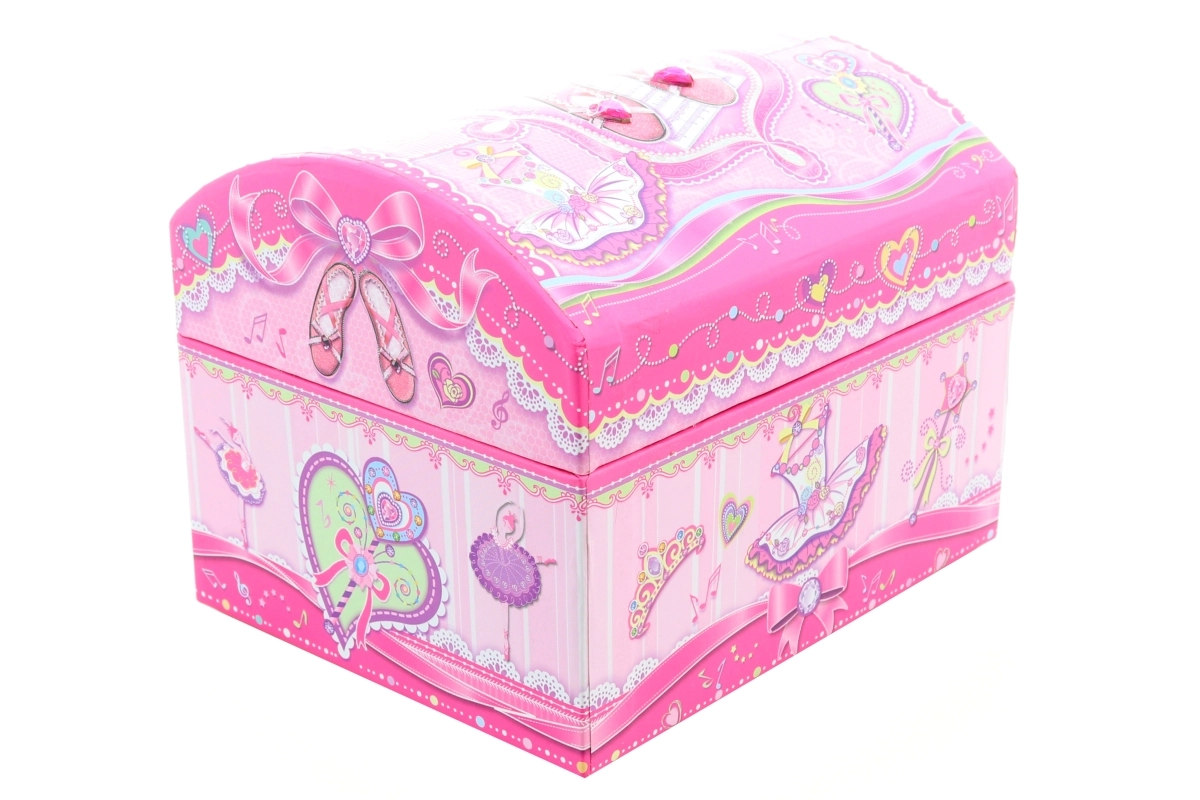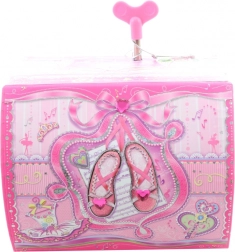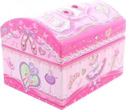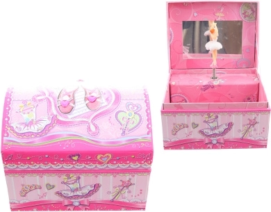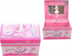 Táto pôvabná šperkovnica v tvare truhličky je ideálnym miestom na uloženie prstienkov, náušníc a ďalších drobností. Po natiahnutí kľúčika a otvorení veka sa roztočí figúrka baletky pred zrkadielkom a rozoznie sa melódia, ktorá navodí čarovnú atmosféru.