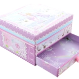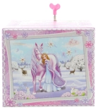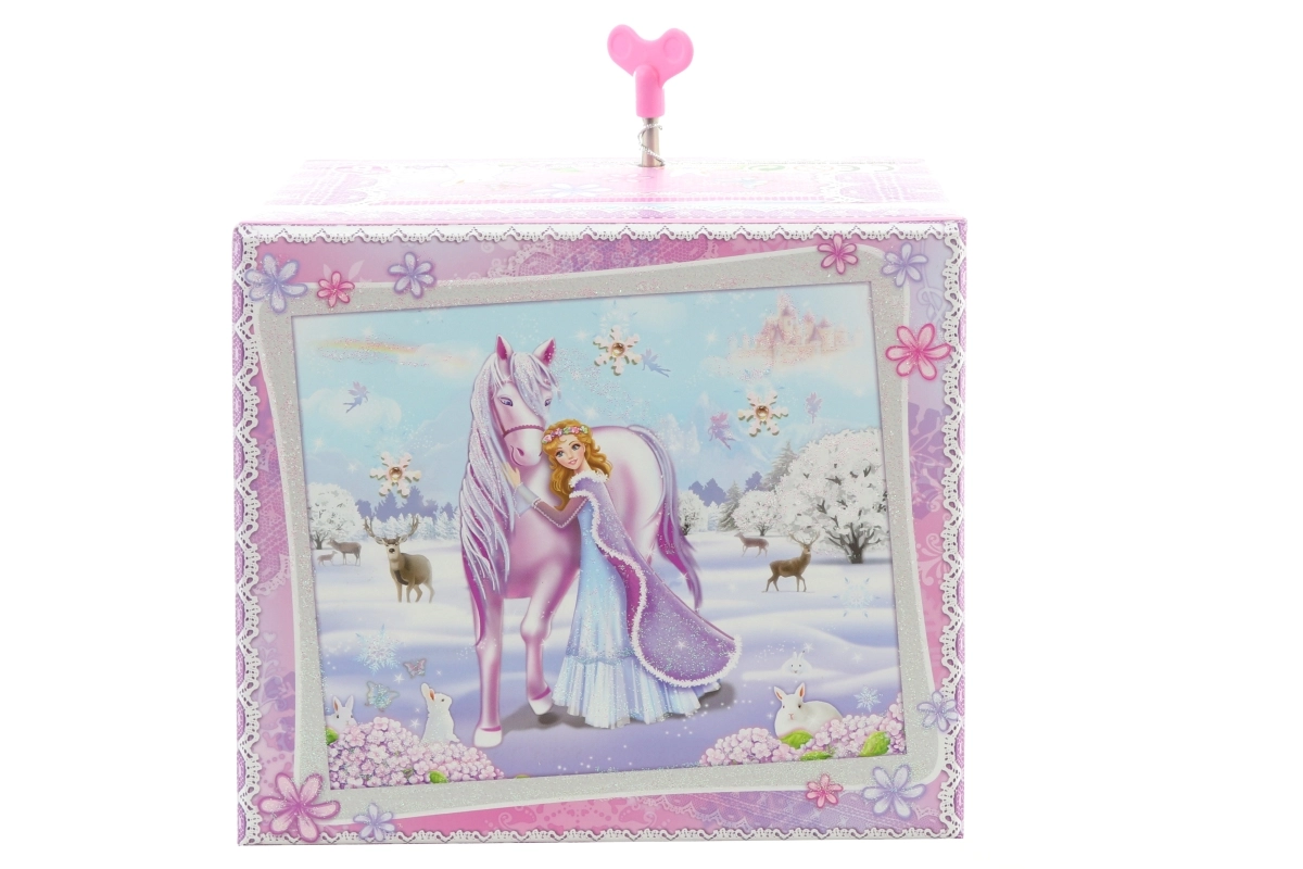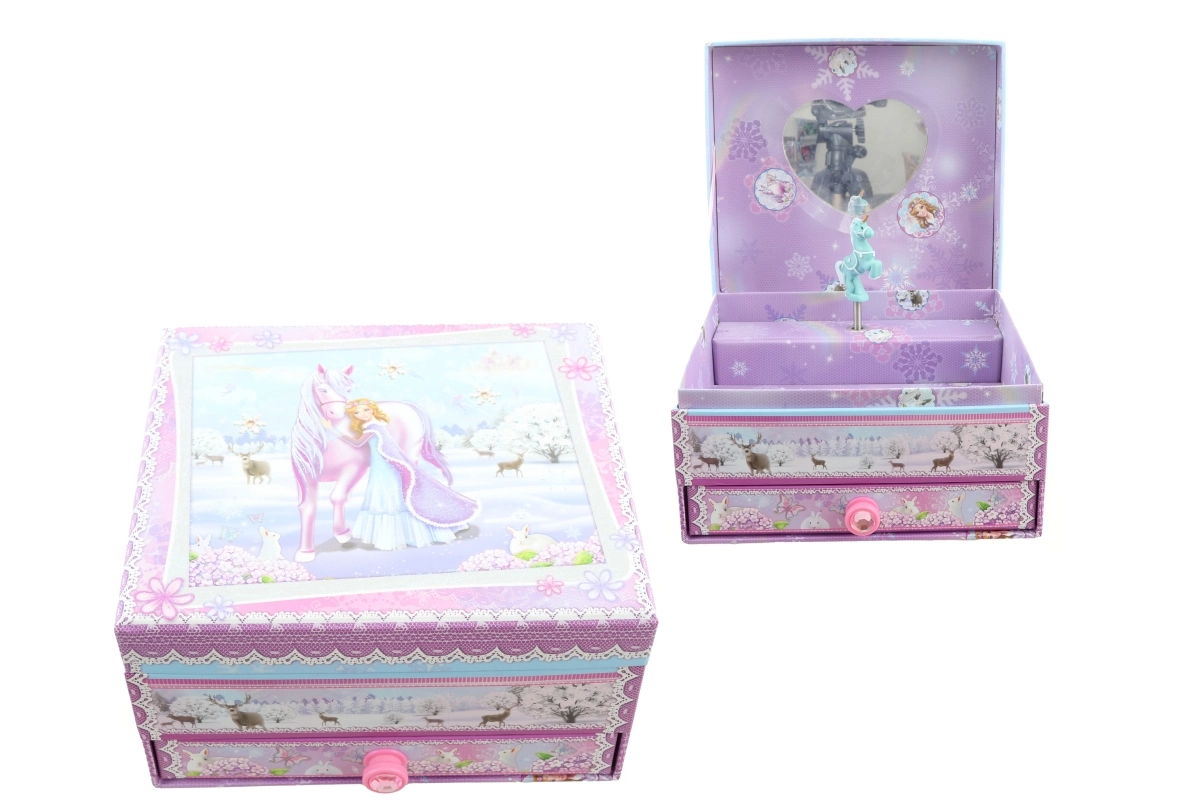 Táto elegantná hudobná šperkovnica s motívom zimnej princeznej a jednorožca kombinuje dekoratívny vzhľad a praktické usporiadanie. Po natiahnutí mechanického strojčeka a otvorení veka sa figúrka začne otáčať a rozoznie sa melódia, ktorá navodí kúzelnú atmosféru.