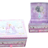 Kúzelná hudobná šperkovnica s motívom jednorožca poteší každú milovníčku drobných pokladov. Po natiahnutí kľúčika sa po otvorení veka roztočí figúrka a zaznie príjemná melódia. Vo vnútri nájdete zrkadielko, praktické pri skúšaní šperkov, a dole výsuvný šuplíček na prstienky, náramky aj ďalšie drobnosti. Kompaktné rozmery cca 16 × 14 × 9 cm a jemné rozprávkové motívy robia z tejto šperkovnice krásny doplnok detskej izby aj tip na darček.
