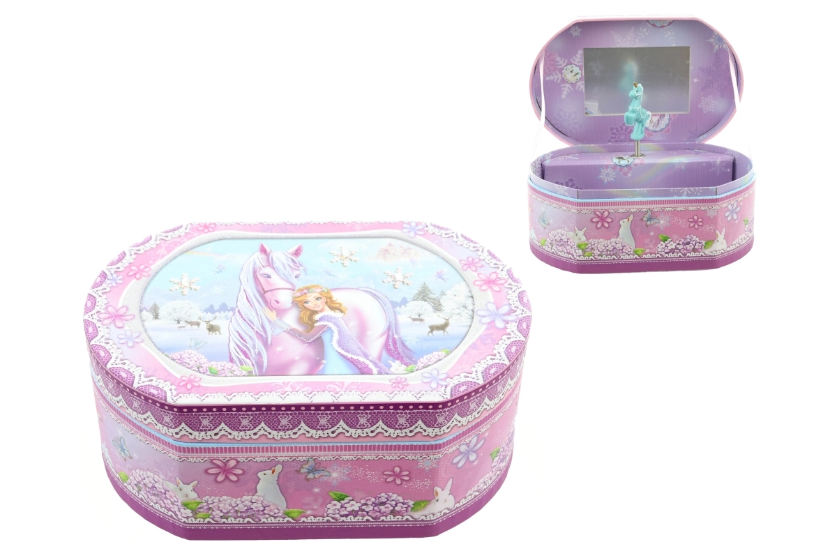 Táto nežná hudobná šperkovnica s motívmi jednorožca a princeznej premení ukladanie prstienkov, náušníc a drobných pokladov na kúzelný rituál. Po natiahnutí kľučky sa vo vnútri roztočí baletka a zaznie príjemná melódia, zatiaľ čo integrované zrkadielko uľahčí skúšanie šperkov.