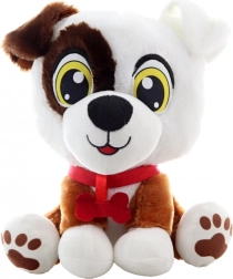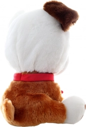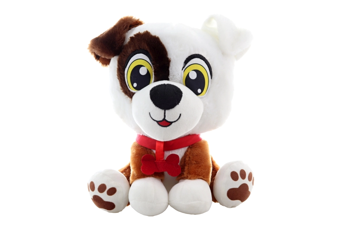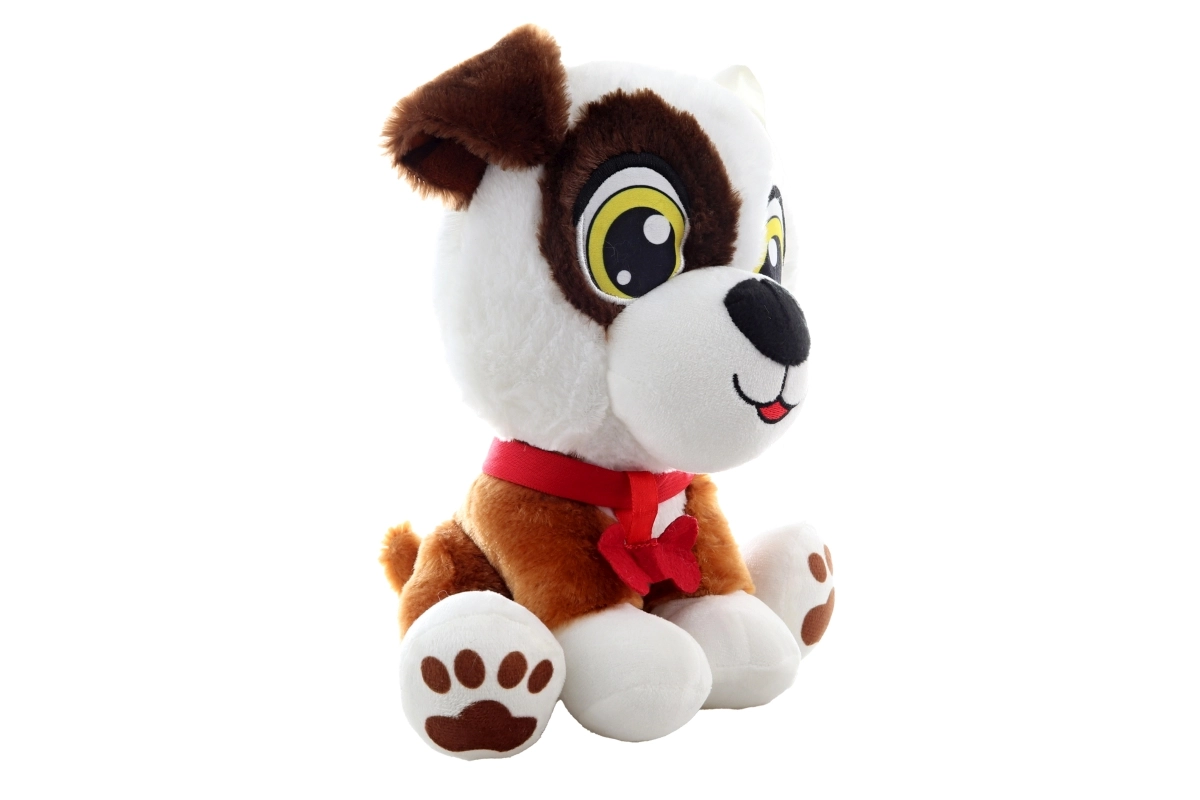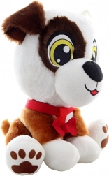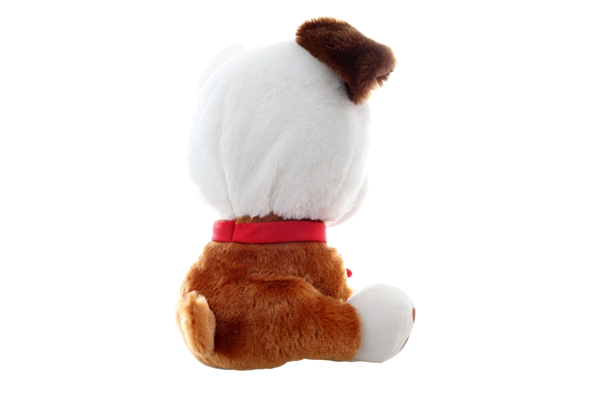 Tento hebký plyšový psík v kombinácii bielej a hnedej farby je stvorený na objatie. Má vyšívané detaily tváre, labky s potlačou a červený obojok s mašličkou a kosťou, vďaka čomu pôsobí priateľsky a hravo. Je bezpečný pre najmenšie deti a skvele sa hodí do postieľky aj do detskej izbičky ako dekorácia.