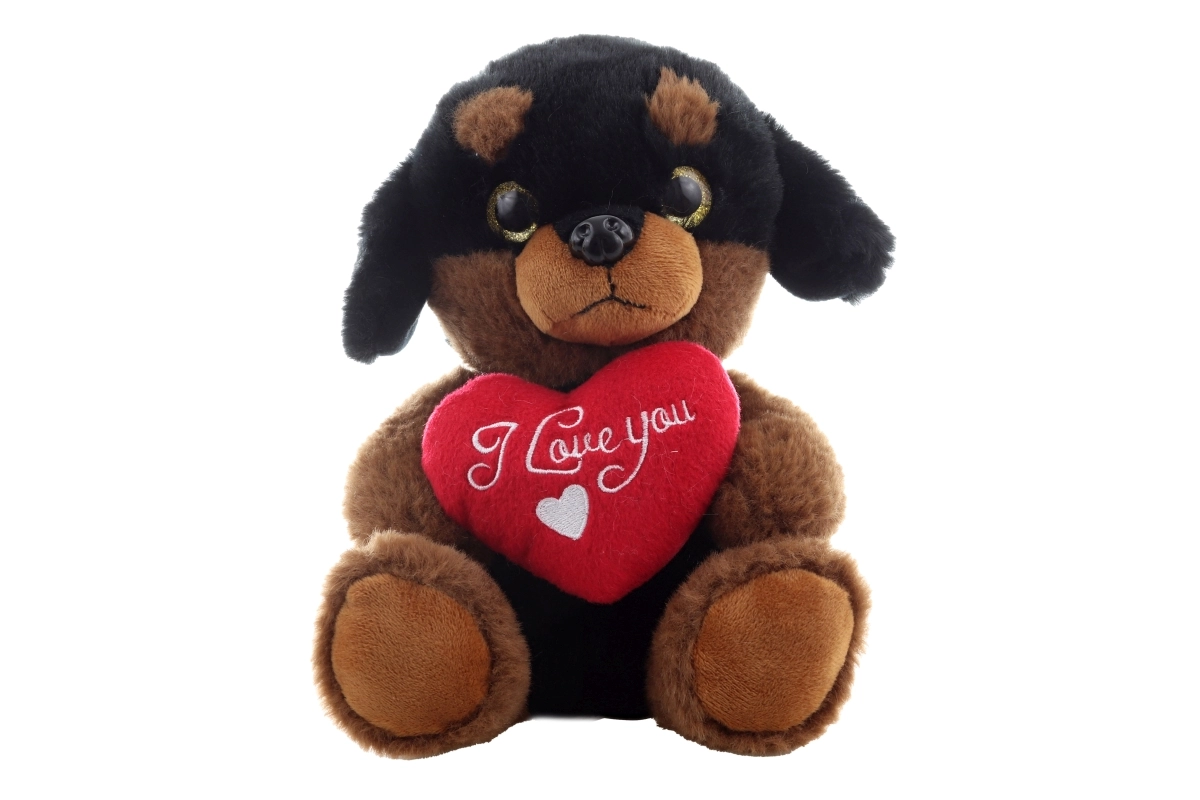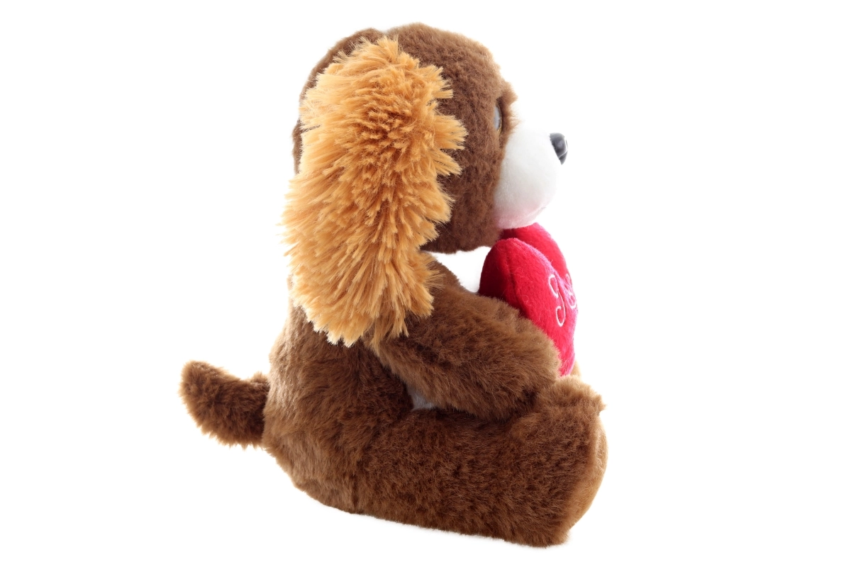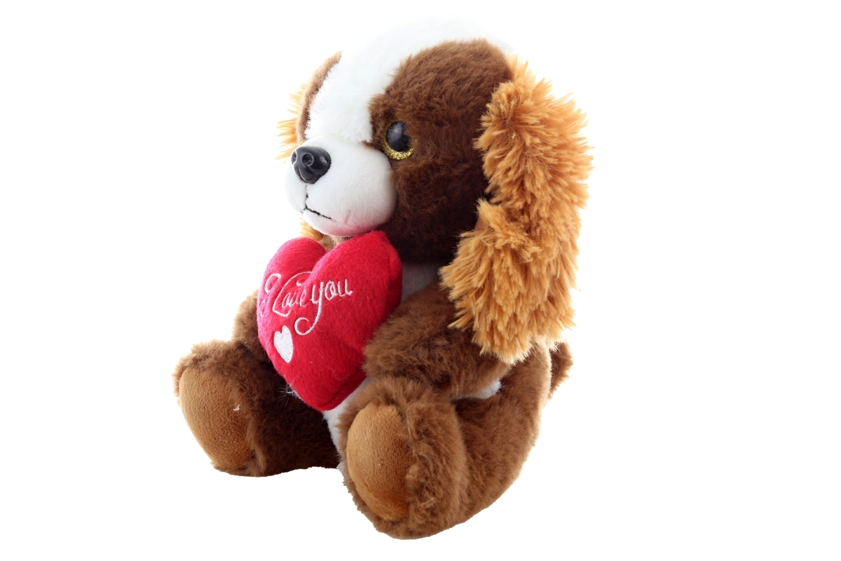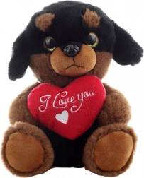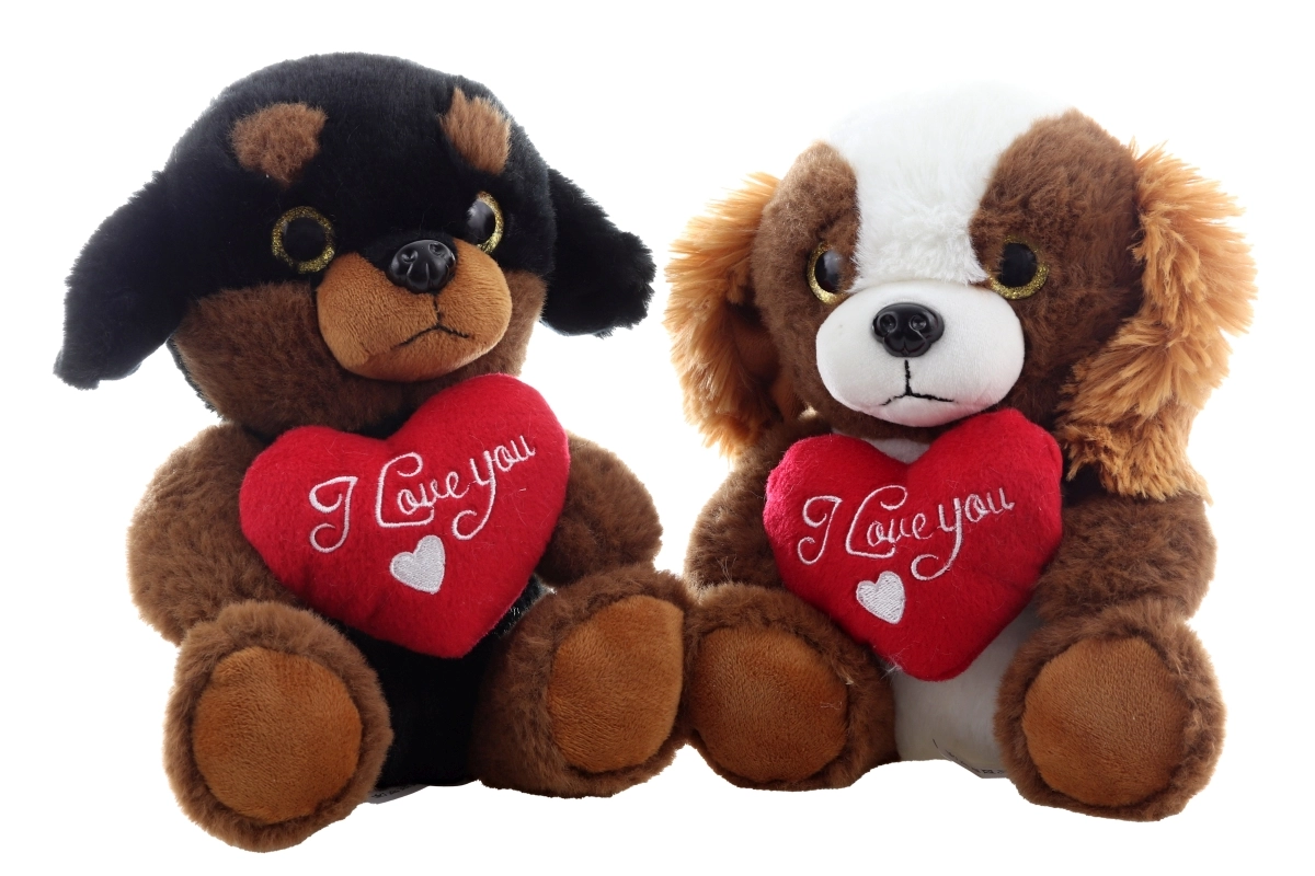 Psík meria približne 21 cm, pekne sedí a v labkách drží červené srdce s nápisom „I love you“. Je k dispozícii v dvoch farebných prevedeniach (dodávame podľa skladovej dostupnosti). Vhodný už od narodenia.