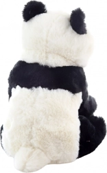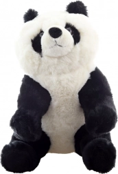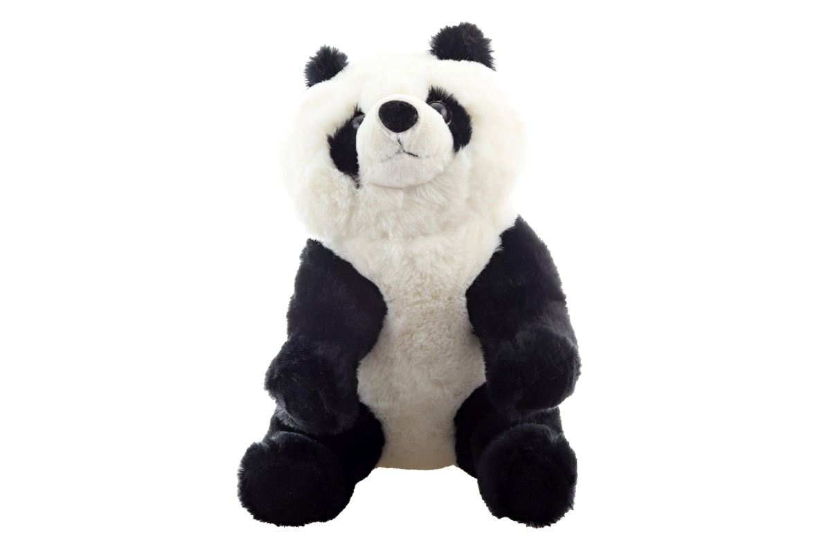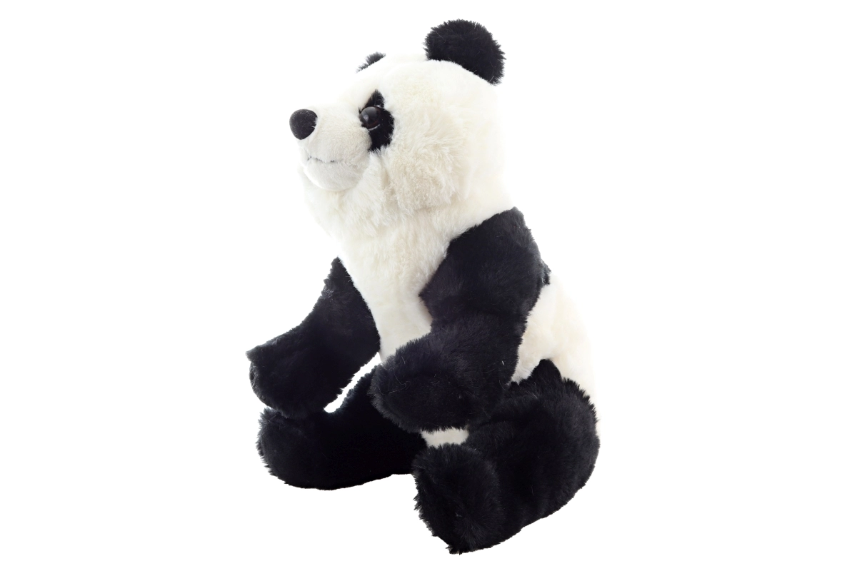 Plastové očká, guľaté ušká a precízne švy dotvárajú realistický vzhľad pandy v sediacej pozícii.