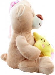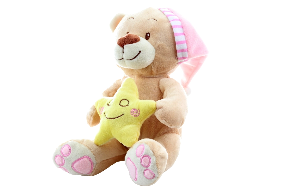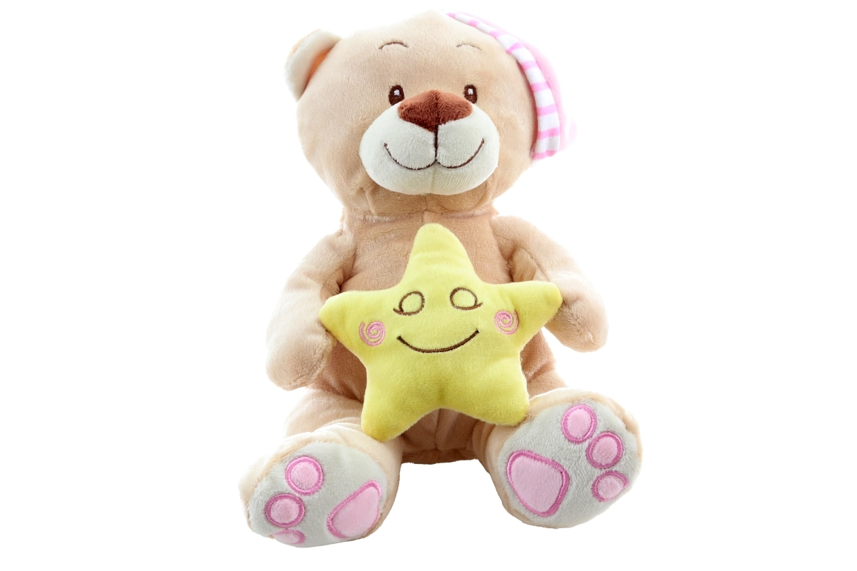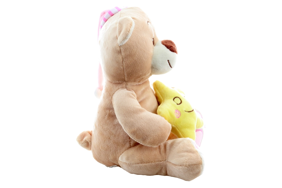 Roztomilý plyšový macko s ružovou čiapočkou a usmievavou hviezdičkou je ideálny spoločník na zaspávanie pre najmenších. Je extra mäkučký, bezpečný od 0+ a skvelý na mojkanie do postieľky aj kočíka.