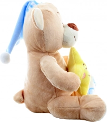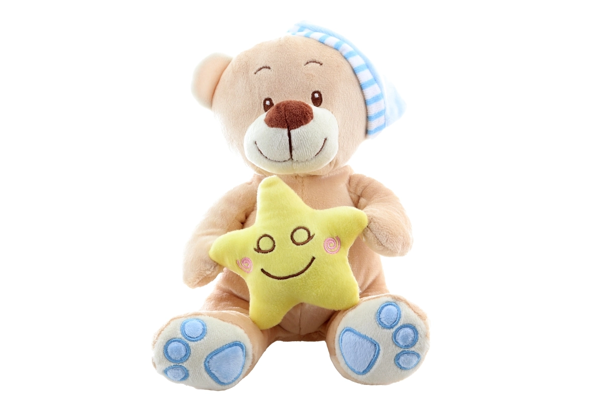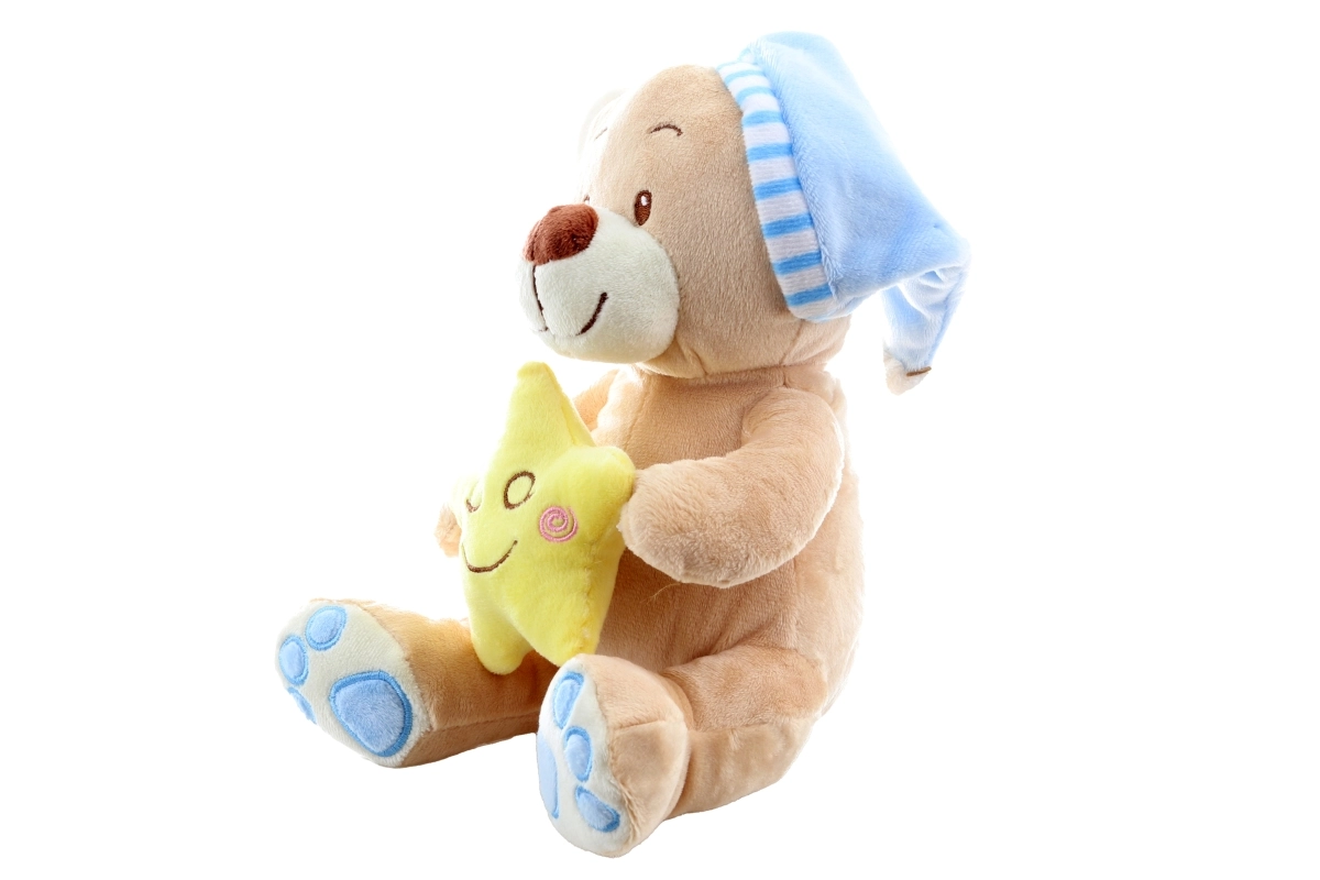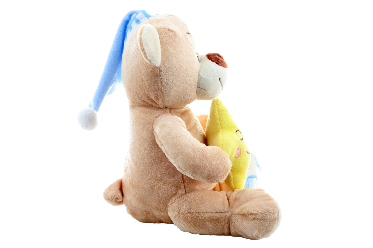 Mäkučký plyš, upokojujúca modrá čiapočka a žltá hviezdička pomáhajú vytvoriť príjemnú atmosféru pred spaním.