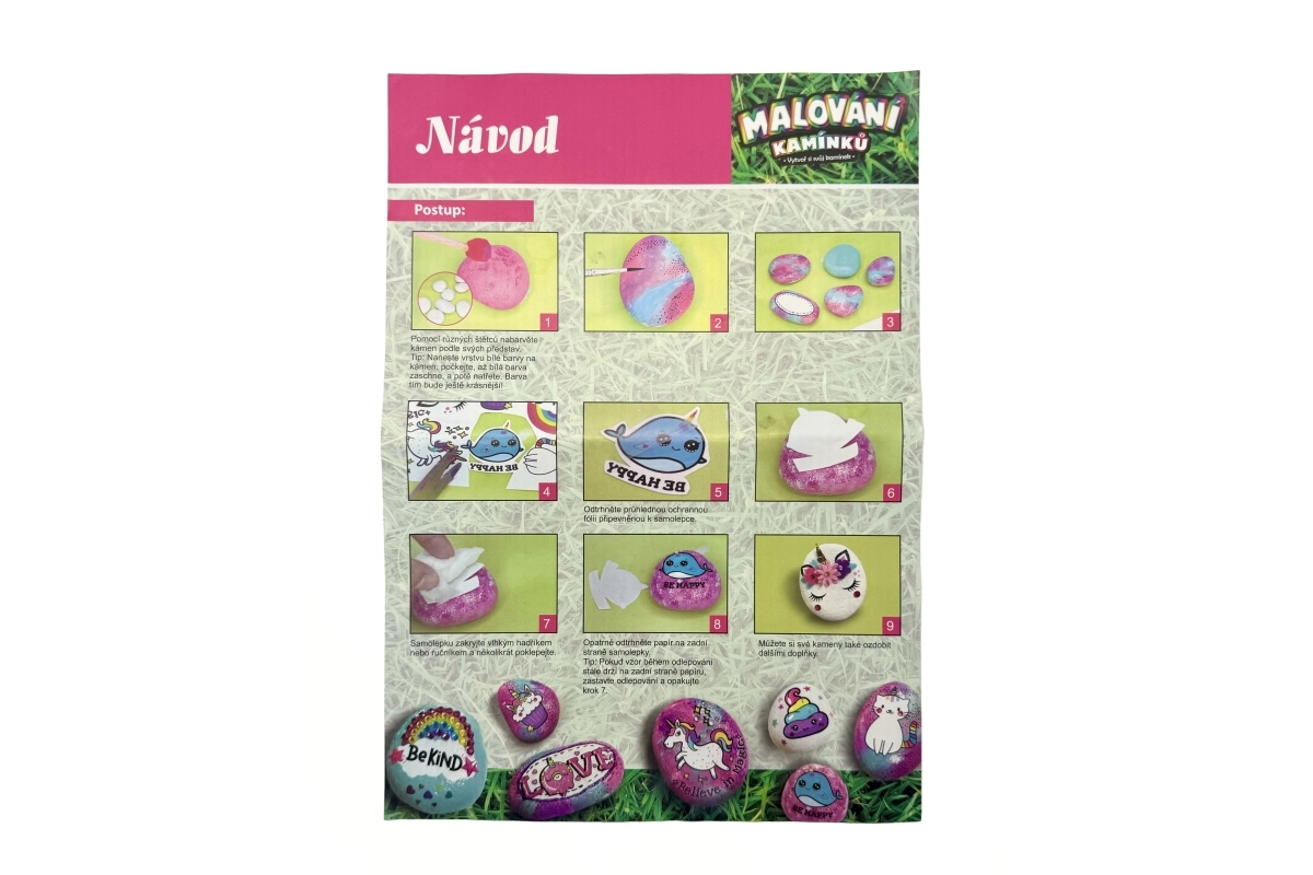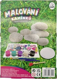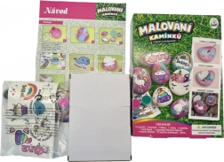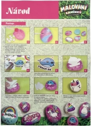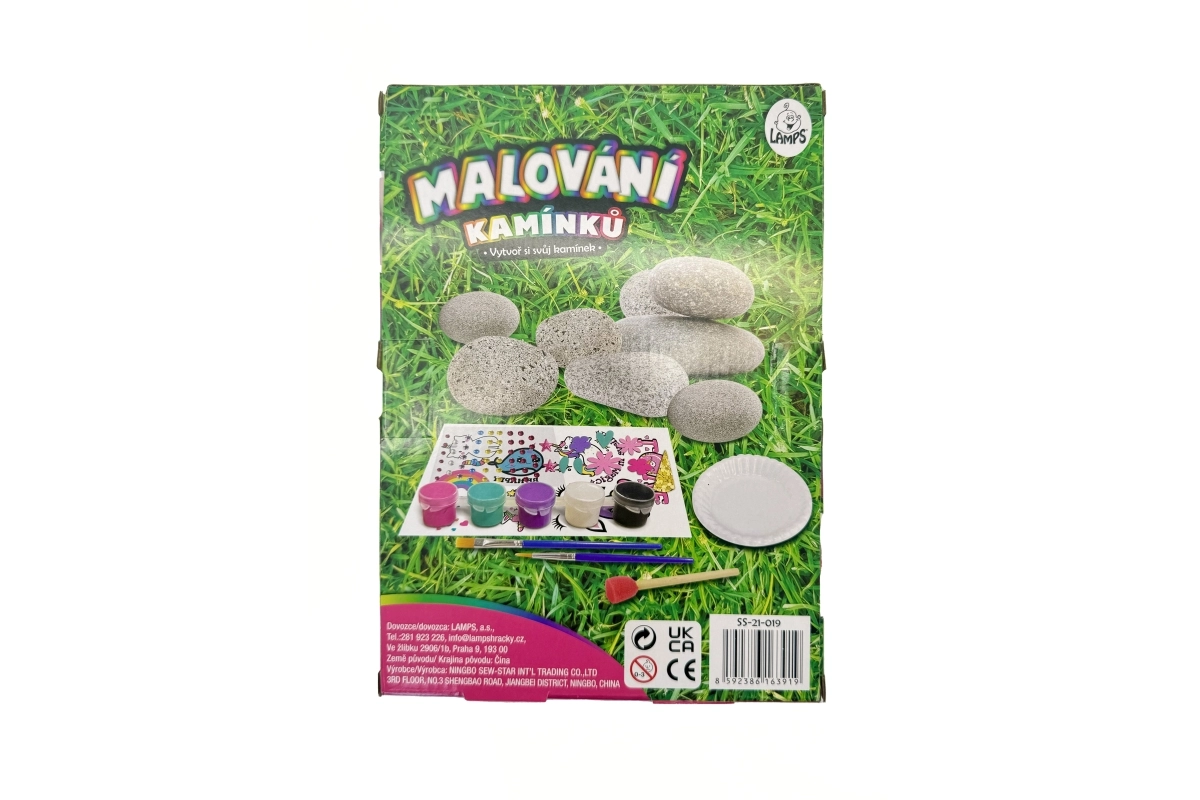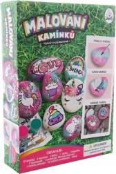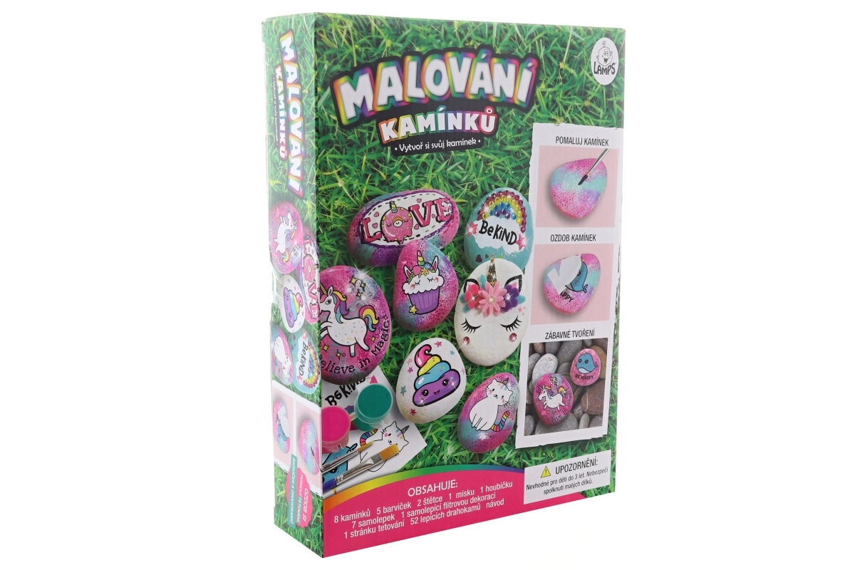 Sada obsahuje 8 kamienkov, 5 farbičiek, 2 štetce, 52 samolepiacich drahokamov a ďalšie doplnky. Vďaka ľahko uzatvárateľným kelímkom s farbou a penovému tampónu je práca čistejšia a presnejšia. Rozmery balenia cca 18 × 25 × 5 cm. Vek: 3+.