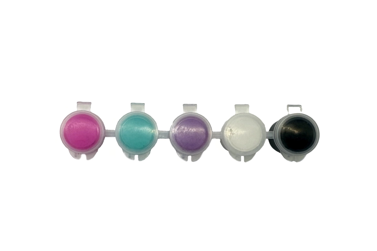 Sada zahŕňa 5 pastelových odtieňov v prepojených kelímkoch s odklápacími viečkami. Farby sa neprelievajú a menej sa rozlievajú – ideálne pre detské tvorenie.