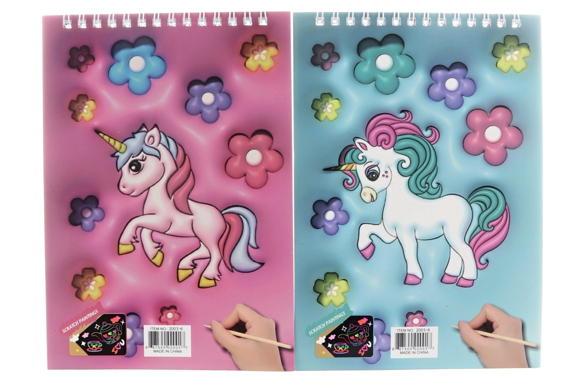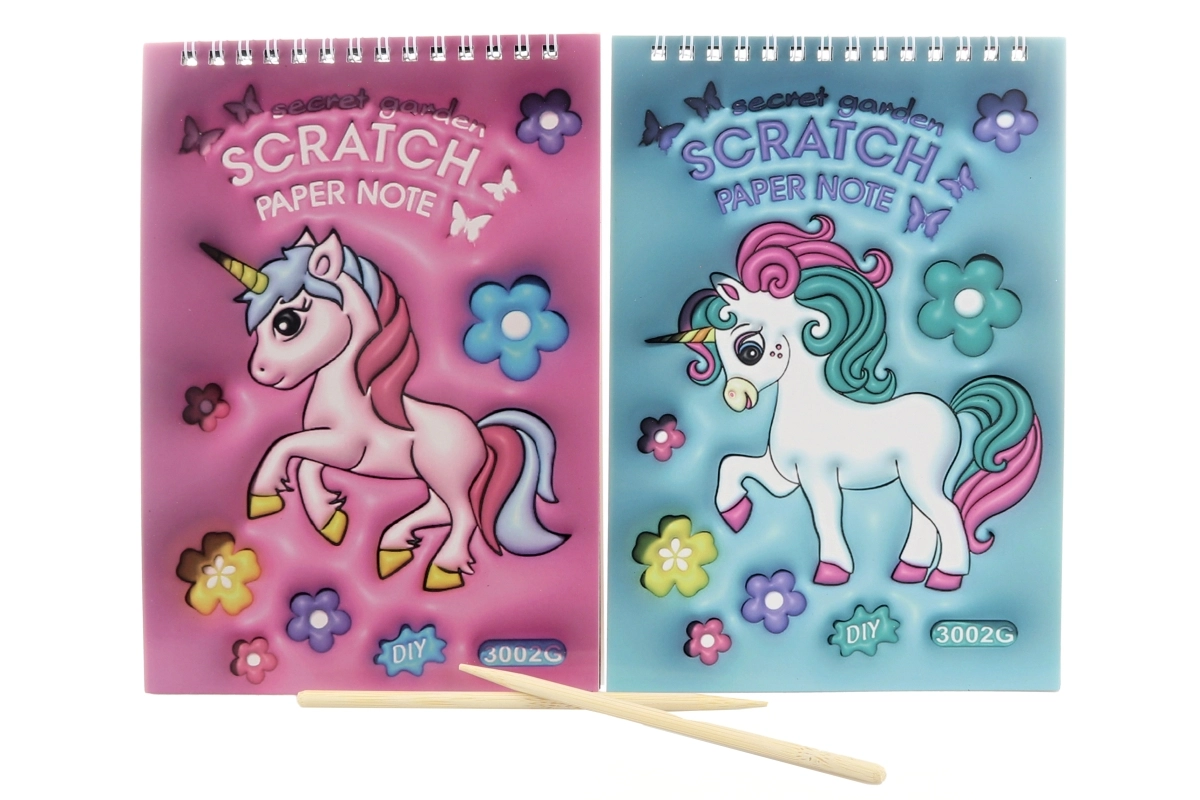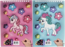 Kreatívny vyškrabovací zošit s motívom jednorožca poteší každého malého umelca. Obsahuje 8 čiernych listov s farebným podkladom, na ktorých možno pomocou priloženého dreveného pera tvoriť originálne obrázky. Praktická krúžková väzba a kompaktný rozmer 14 × 20 cm z neho robia ideálnu pomôcku na cesty aj domov.