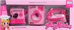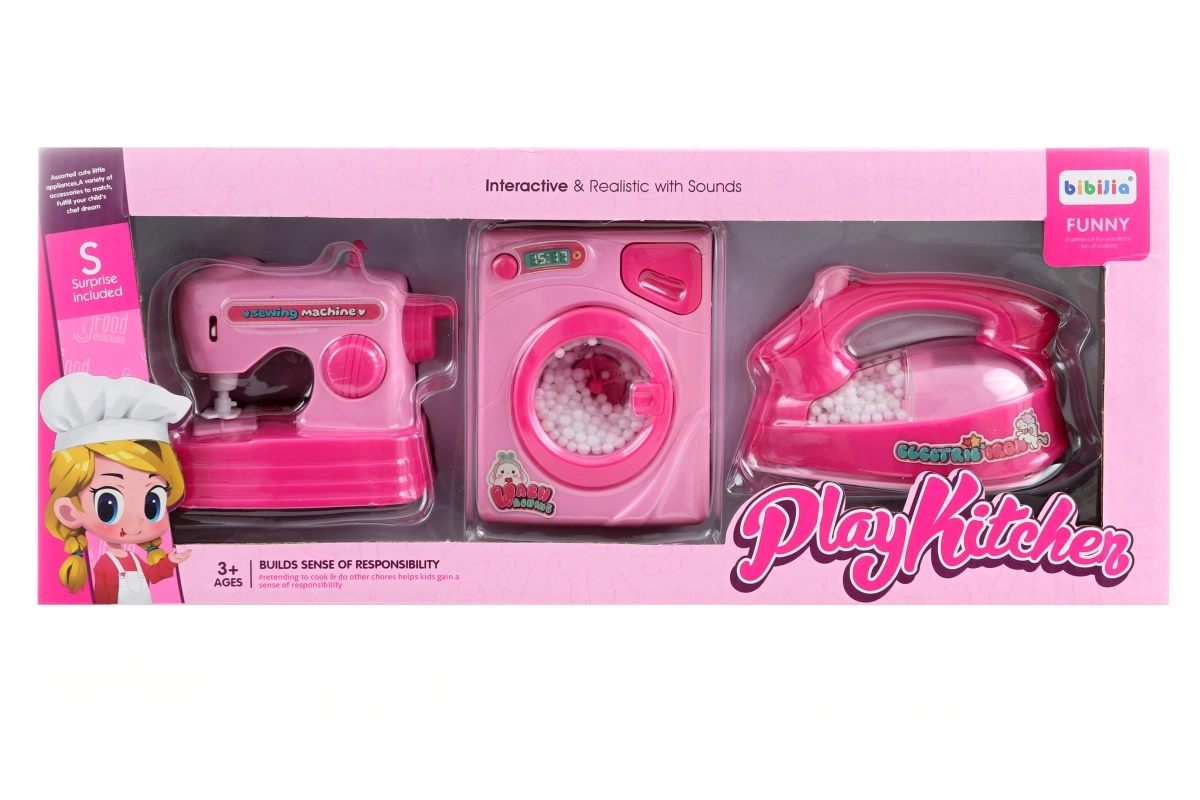 Zábavná sada domácich spotrebičov pre malých pomocníkov prináša realistické funkcie a bezpečnú hru. Žehlička so svetlom a zvukom, práčka s rotujúcim bubnom a šijací stroj napodobňujúci skutočný pohyb podporujú predstavivosť a rozvoj jemnej motoriky. Každý spotrebič je napájaný 2× AA batériami (nie sú súčasťou). Vhodné pre deti od 3 rokov.