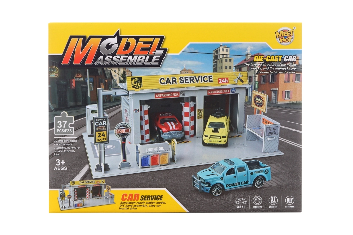 Postavte si vlastný autoservis a vyrazte na cestu s kovovým autíčkom! Sada obsahuje dieliky z mäkkého kartónu na jednoduché zostavenie a jedno kovové autíčko na okamžitú zábavu. Ideálne pre deti od 3 rokov, rozvíja jemnú motoriku, fantáziu a trpezlivosť. Rozmery zostaveného autoservisu sú 20 × 13,6 × 8,3 cm.
