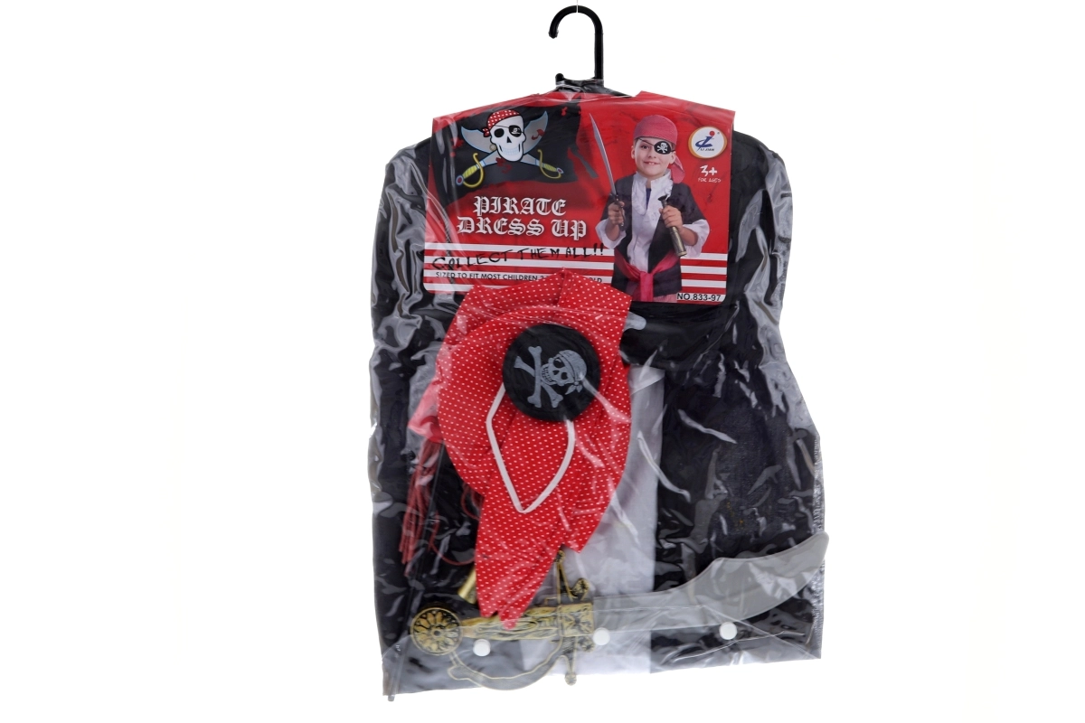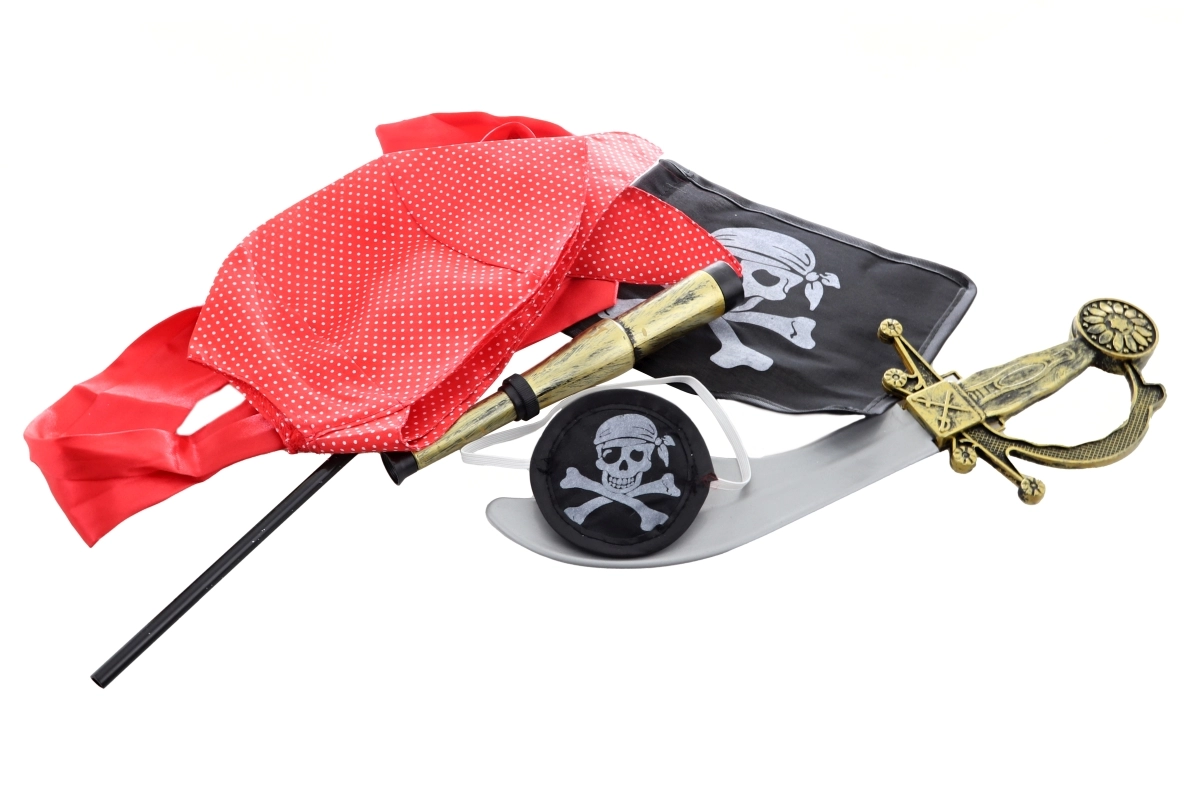 - Plášť, šortky, šabľa, pirátska vlajka, šatka na hlavu, opasok, páska na oko