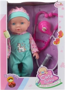 Súprava obsahuje detský stetoskop a injekciu s bezpečnými tvarmi, ktoré podporia kreatívnu a napodobivú hru. Vďaka kompaktnej veľkosti 27 cm je bábika ideálna do detských rúk a ľahko sa zmestí do kočíkov pre bábiky. Balené v darčekovej krabici – skvelý tip na darček.