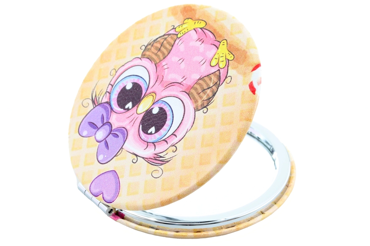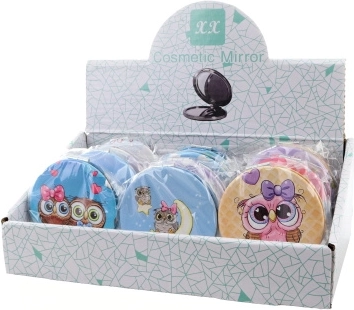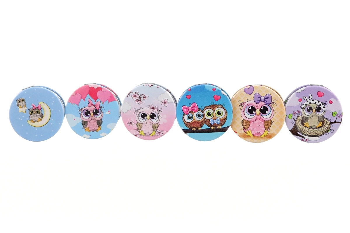 Po otvorení nájdete dvojité zrkadielko – praktické na detailné úpravy make-upu alebo rýchlu kontrolu účesu počas dňa. Zrkadielka sú dodávané v rôznych dizajnoch s motívmi sovičiek; konkrétna varianta je vybraná podľa skladovej dostupnosti.