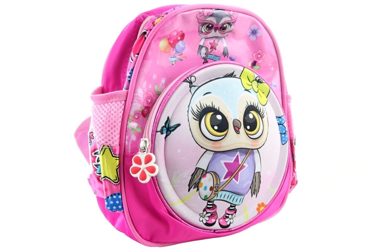 Tento ľahký a praktický batoh v ružovej farbe s veľkou sovičkou je ideálny na drobnosti na cesty aj do škôlky. Hlavná komora pojme desiatu, hračku aj pršiplášť, predné okrúhle vrecko je skvelé na kľúče alebo vreckovky. Tvarovaná predná strana a kvalitné zipsy s dekoratívnymi ťaháčikmi dodávajú batohu štýl aj odolnosť.