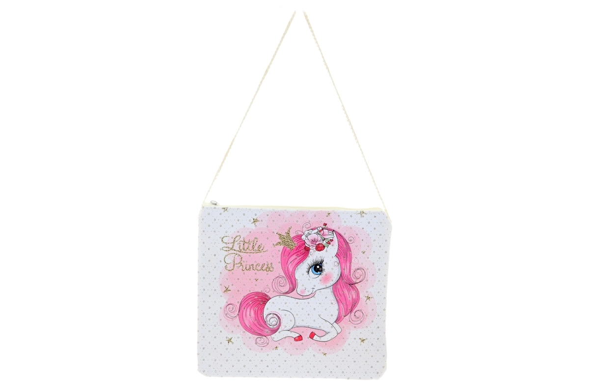 Táto dekoratívna kabelka s motívom jednorožca vyniká výraznou lesklou potlačou na prednej strane (koženka) a príjemným látkovým spracovaním. Je ideálna ako štýlový doplnok k outfitu, na drobnosti alebo ako darček pre milovníkov jednorožcov.