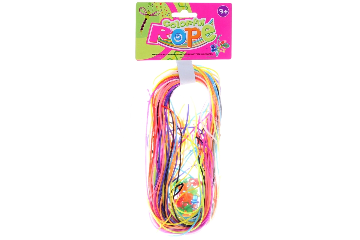 Obsah balenia zahŕňa gumové šnúry na zapletanie a plastové doplnky v tvare cumlíkov, ktoré dodajú výrobkom hravý vzhľad. Sada je ľahká a skladná, balená vo vrecku – ideálna na cesty aj domáce tvorenie.