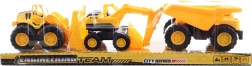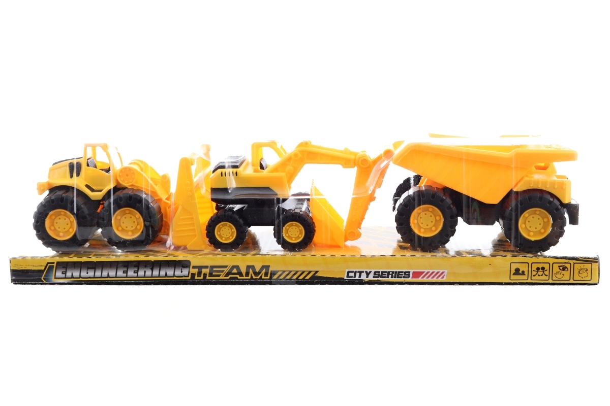 Zábavná sada stavebných strojov pre malých staviteľov od 3 rokov. Vozidlá majú kolesá s voľnobehom, sú vyrobené z odolného plastového materiálu a skvele padnú do detskej ruky.