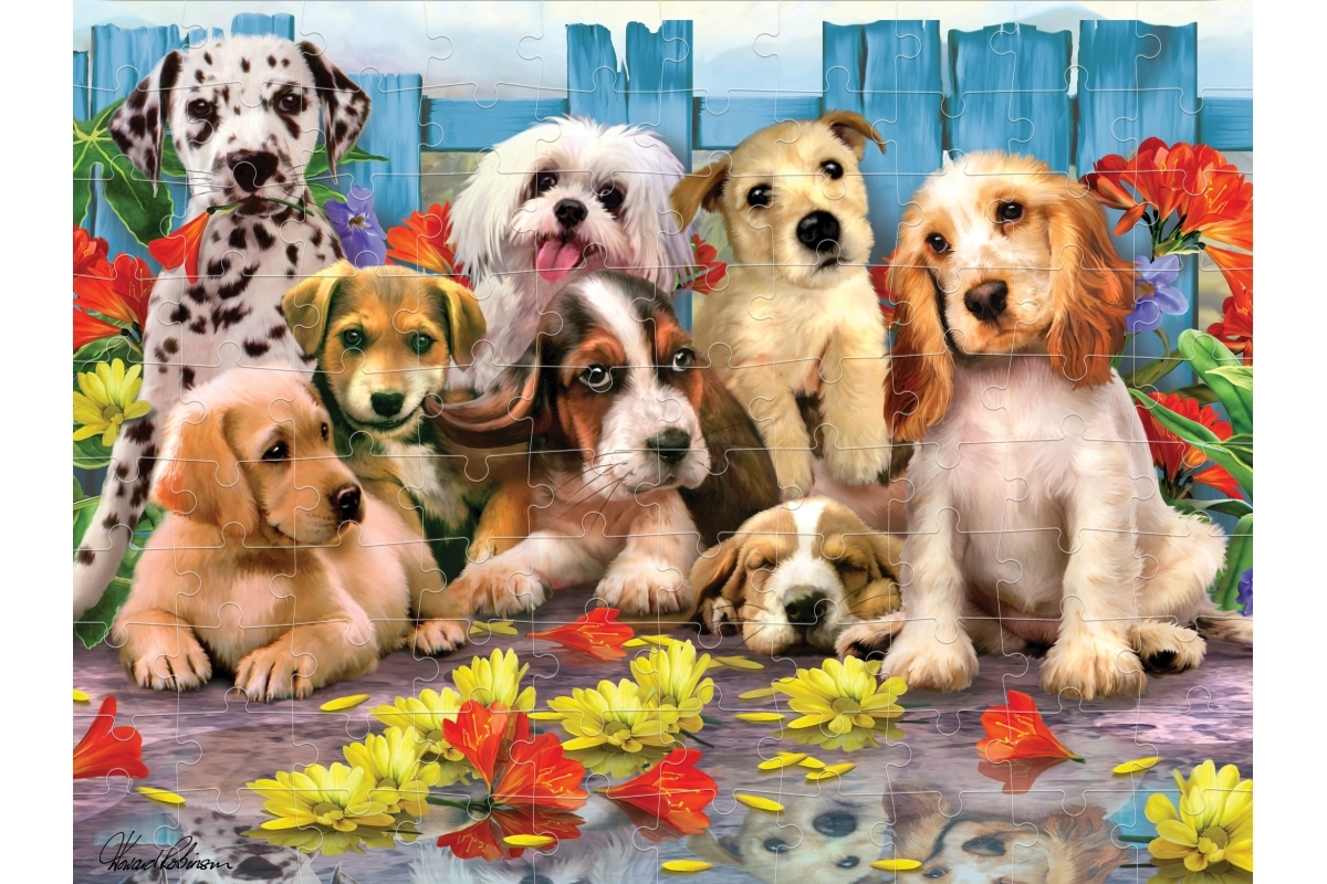 Farebná ilustrácia plná šteniat a kvetov poteší deti aj dospelých a láka skladať znova a znova.