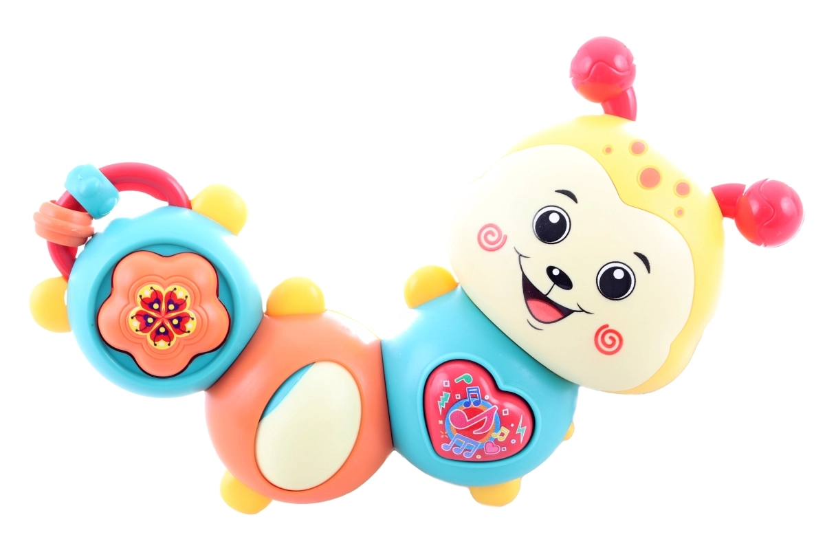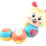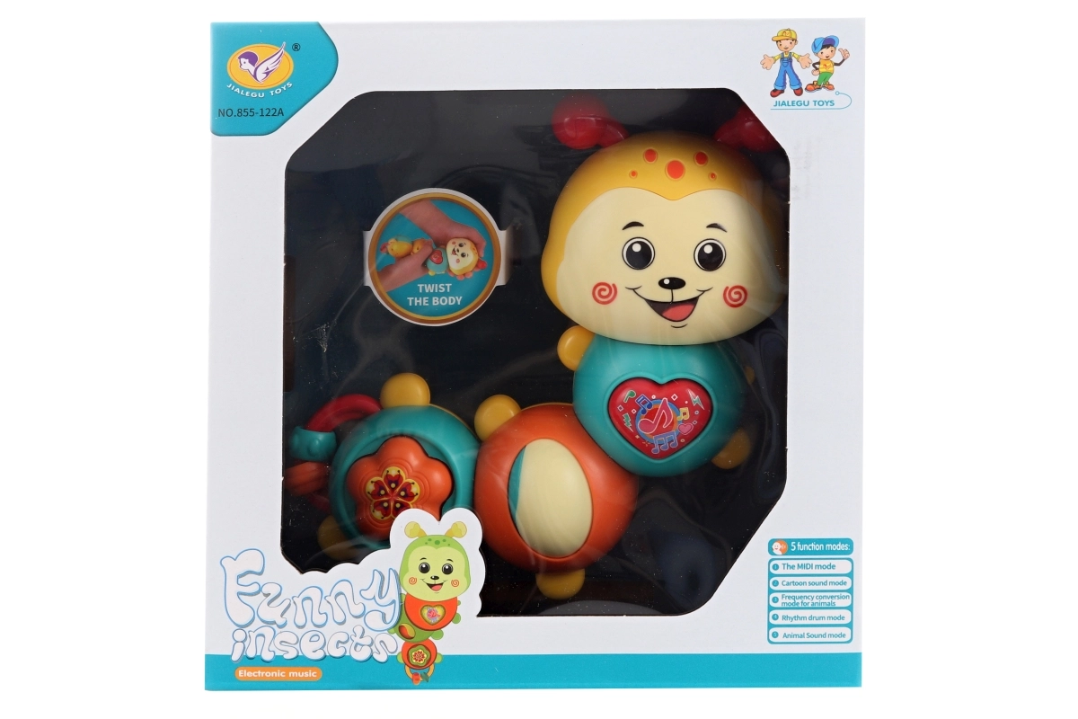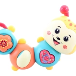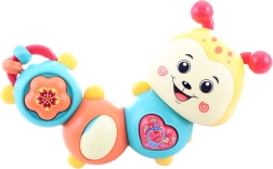 Po vložení batérií húsenica prehráva veselé melódie a zvuky, ktoré udržia deti v pozornosti a podporia sluchové vnímanie.