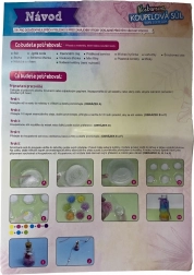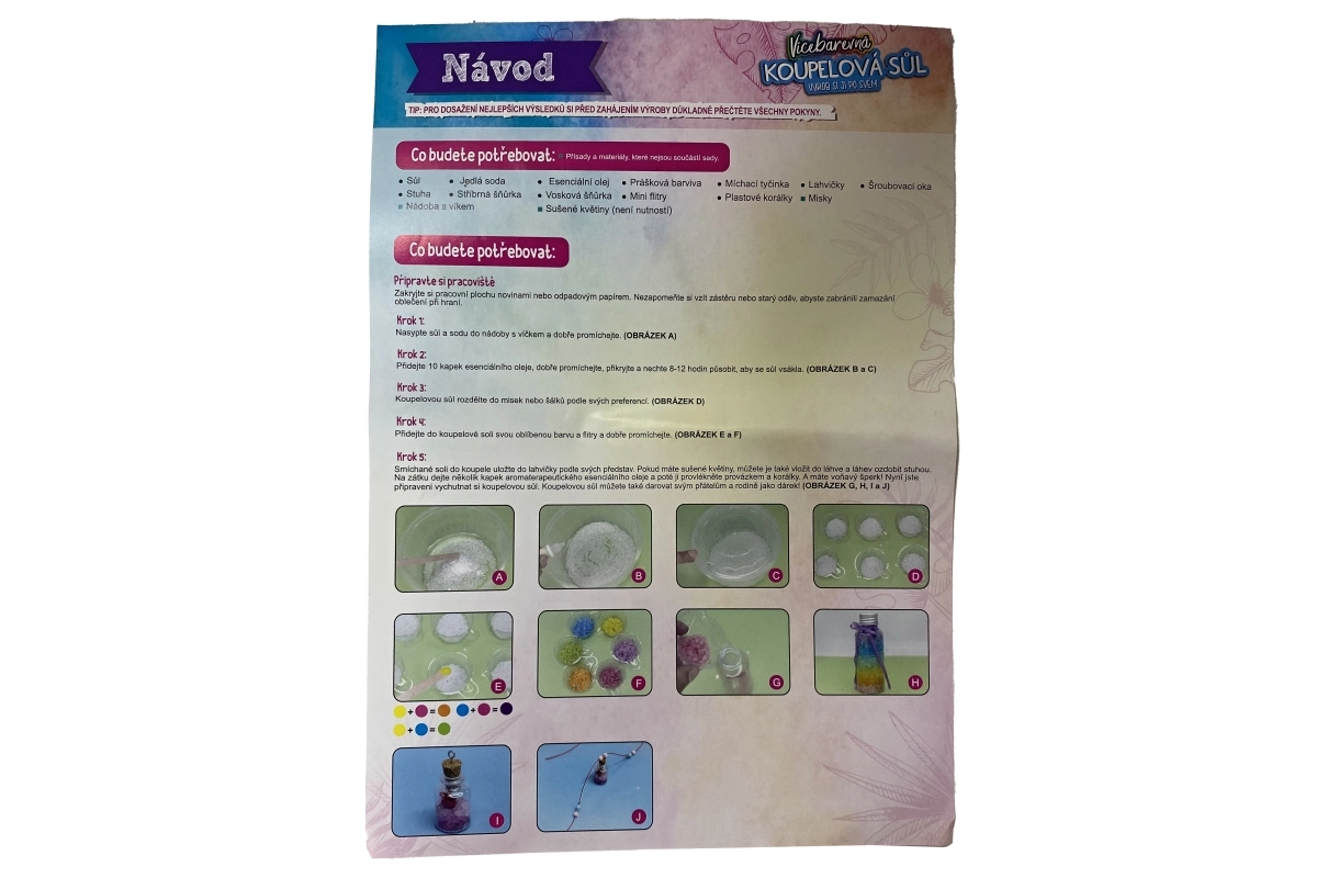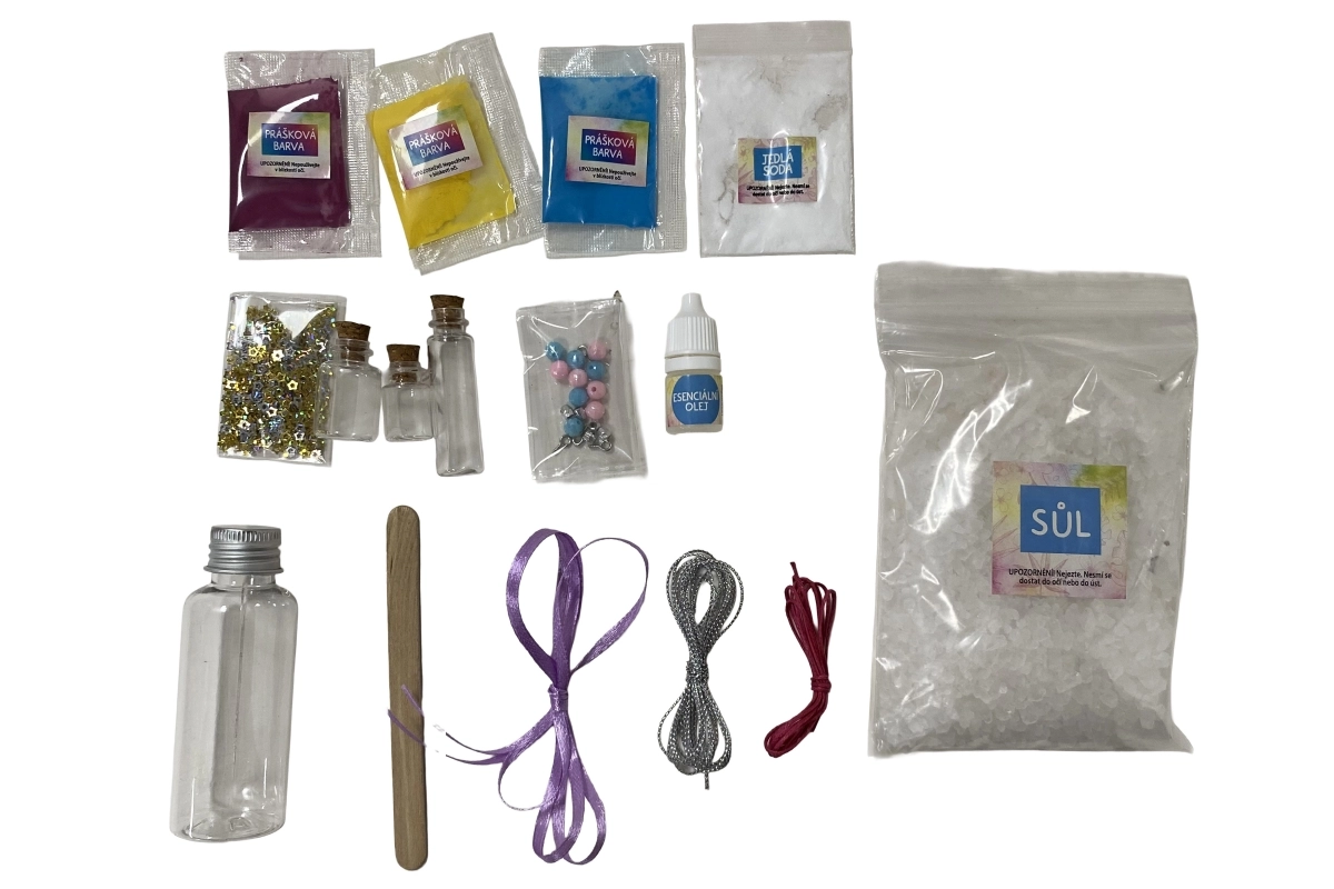 - soľ, jedlá sóda, esenciálny olej, fľaštičky, farebné prášky, miešacie tyčinky, skrutkovacie očká, strieborná šnúrka, stuha, vosková šnúrka, mini filtre, plastové koráliky, návod