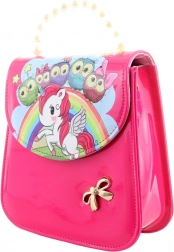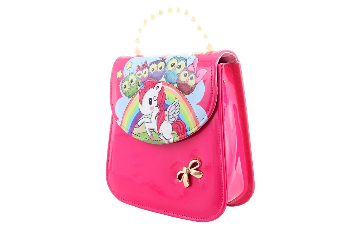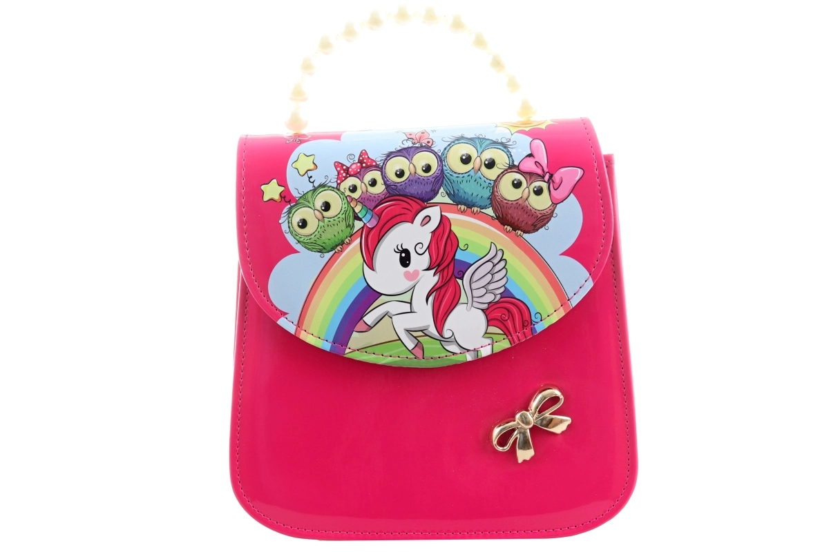Táto štýlová ružová kabelka s farebnou potlačou jednorožca, dúhy, hviezdičiek a sovičiek je navrhnutá pre deti, ktoré milujú hravý dizajn a zároveň chcú mať svoje poklady po ruke. Lesklý povrch sa ľahko udržiava a pôsobí elegantne.