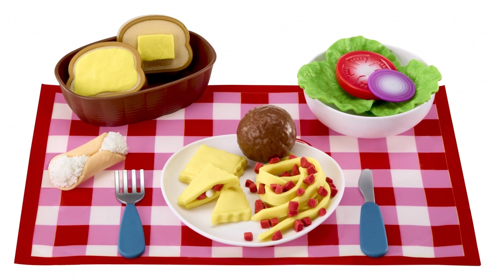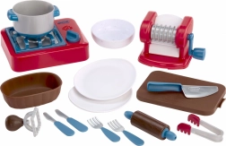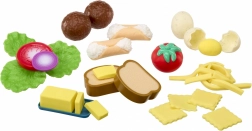 Hrnce, panvica, taniere, príbory, doska na krájanie, valček a plastové potraviny (pečivo, vajcia, listy šalátu, paradajka, cibuľa, maslo, mäsové guľôčky, cannoli) pre kompletné stolovanie.