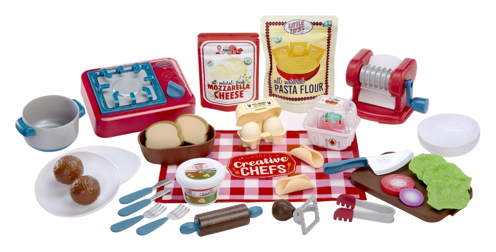 Funkčný extrudér na cestoviny a doplnky umožní deťom lisovať rôzne tvary „rezancov“ a raviol, vaľkať „cesto“ a pripraviť autentickú taliansku hostinu.