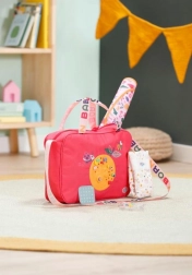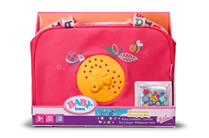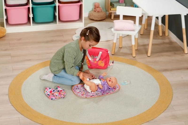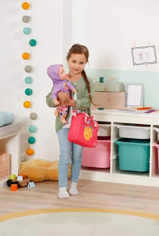 Prebaľovacia taška BABY born je ľahká, pevná a navrhnutá tak, aby udržala všetky nevyhnutnosti pre starostlivosť o bábiku prehľadne po ruke. Taška má zips, praktické vrecká a pohodlný popruh cez rameno. Farebné motívy a hravé detaily robia z každej prechádzky štýlové dobrodružstvo.