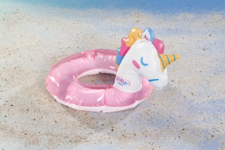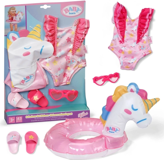 Roztomilá plavecká sada pre bábiky BABY born s veľkosťou 43 cm prináša letnú zábavu do vody aj do vane. Obsahuje ružové plavky s motívom jednorožca, nafukovací kruh v tvare jednorožca, srdiečkové okuliare a ružové sandáliky. Vďaka jednoduchému obliekaniu si deti precvičia jemnú motoriku a užijú si kreatívnu hru plnú letných dobrodružstiev. Vyrobené z kvalitných a odolných materiálov pre bezpečné hranie.