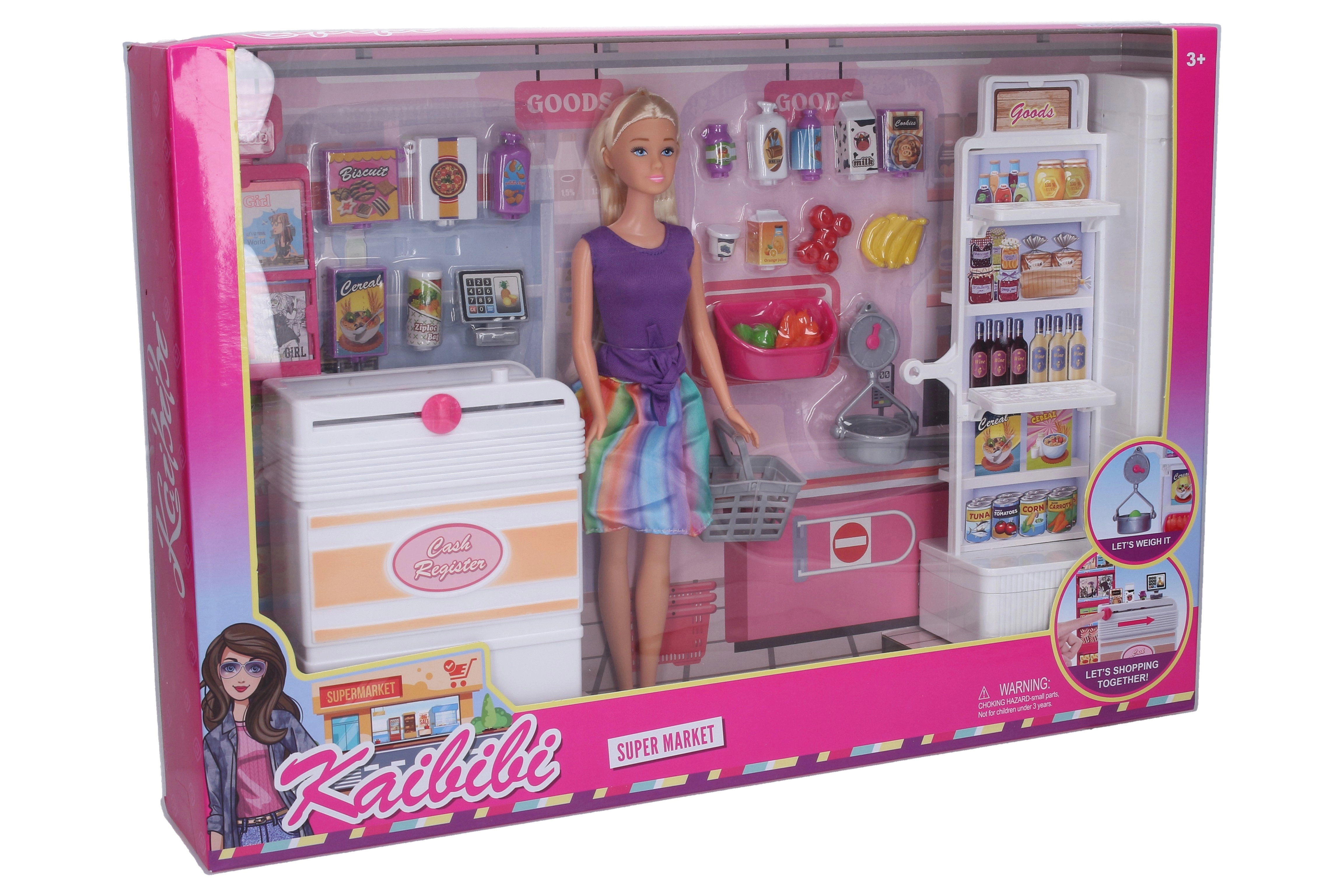 - Kompletné vybavenie – bábika 30 cm, regál, potraviny, pokladňa s pásom, košík a ďalšie doplnky.