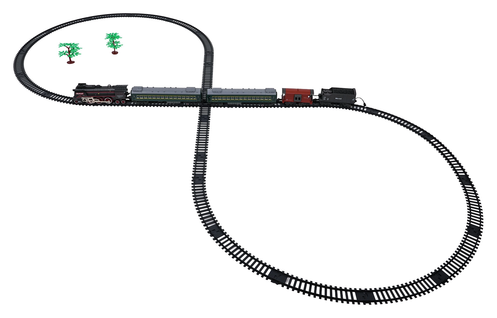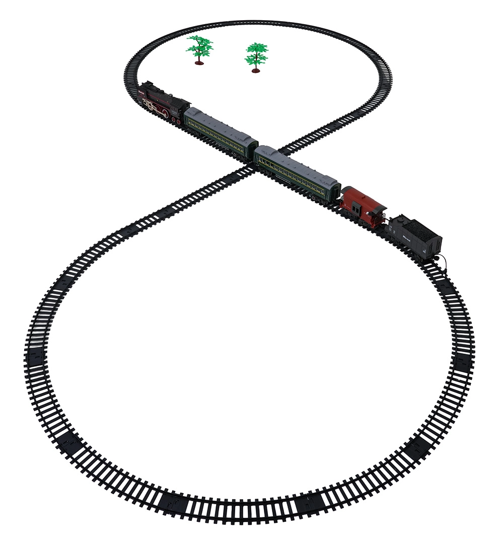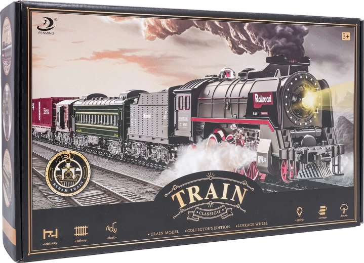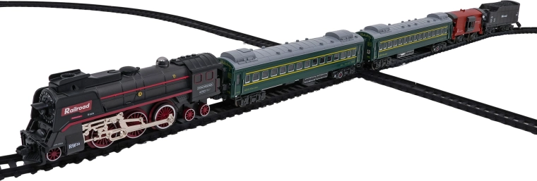 Sada obsahuje lokomotívu, 2 osobné vozne, vozeň s uhlím a nákladný/zvierací vozeň, ktoré spolu tvoria pôsobivú súpravu. Odolné plastové koľaje sa rýchlo zostavujú do veľkého okruhu s rozmerom približne 216 × 92,5 cm. Pre pokojnejšie hranie je možné zvuky lokomotívy vypnúť.