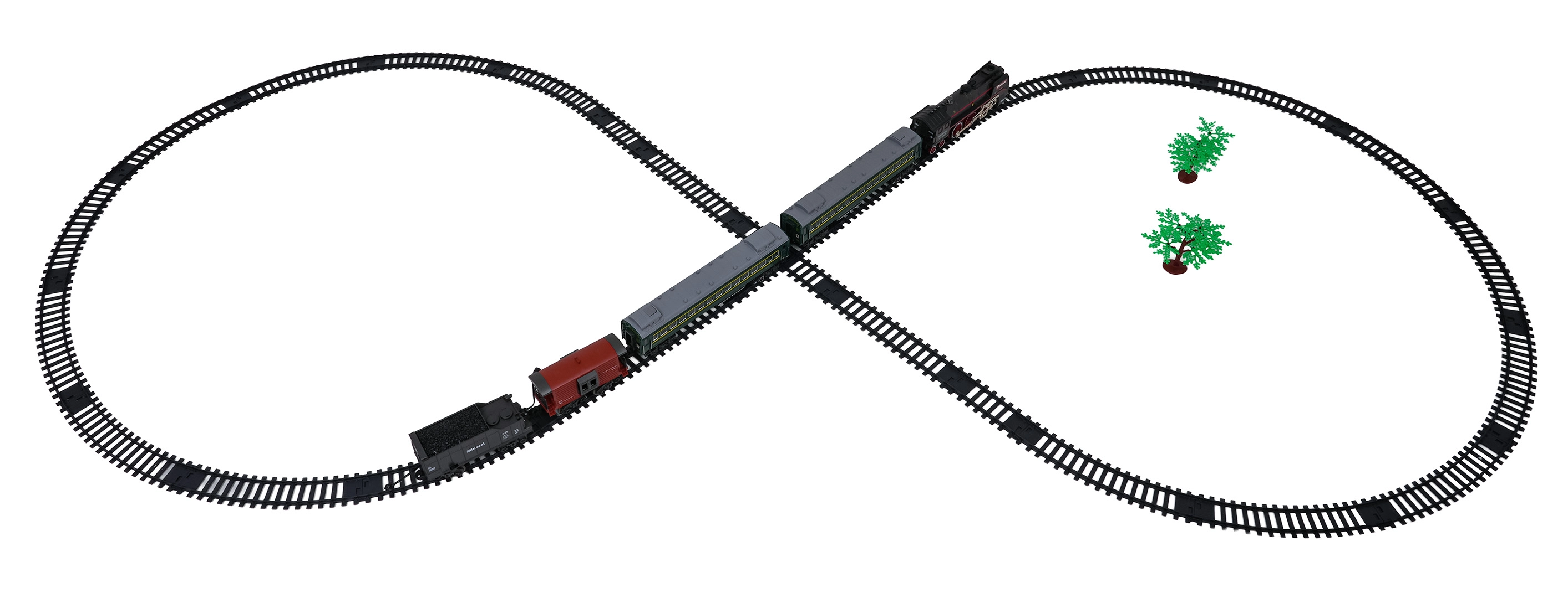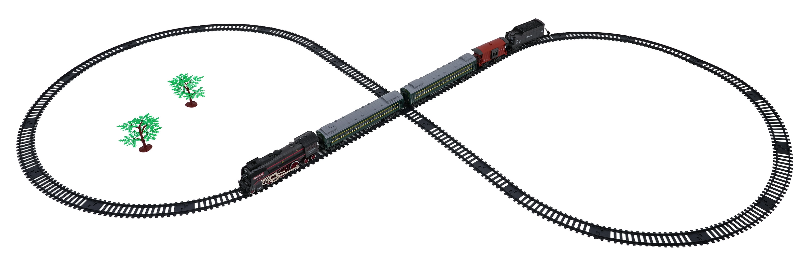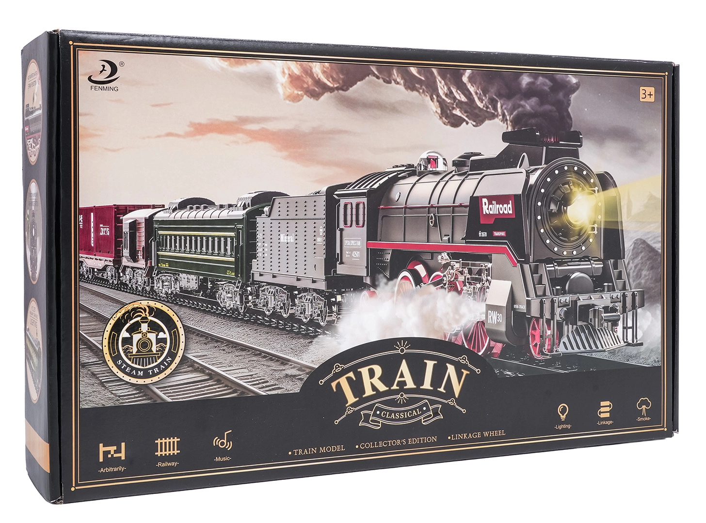 Sada obsahuje lokomotívu, 2 osobné vozne, vozeň s uhlím a nákladný/zvierací vozeň, ktoré spolu tvoria pôsobivú súpravu. Odolné plastové koľaje sa rýchlo zostavujú do veľkého okruhu s rozmerom približne 216 × 92,5 cm. Pre pokojnejšie hranie je možné zvuky lokomotívy vypnúť.